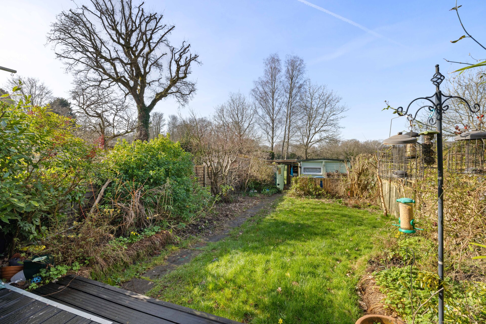 Outside, the rear garden offers a generous decking area ideal for outdoor dining, along with lawned sections providing plenty of space to relax or for children to play. A cabin home office adds excellent versatility, perfect for working from home or as a teenager’s retreat. The garden also benefits from direct access to Camelsdale Recreation Ground, as well as vehicle access should additional parking be required.