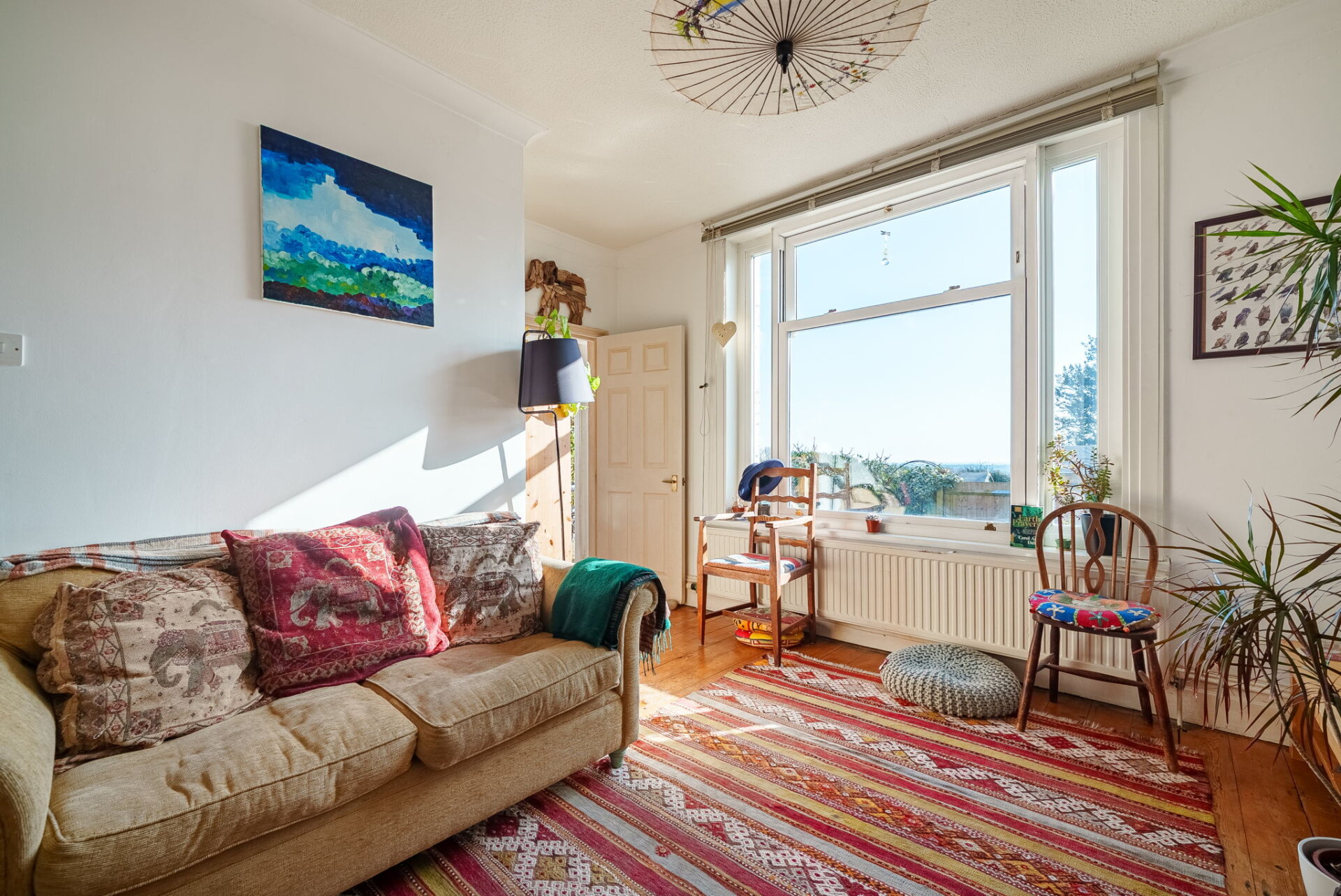 There is space for a comfortable sofa and a small dining table, making it a versatile area for both relaxing and everyday living, while character features add warmth and charm to the room.
