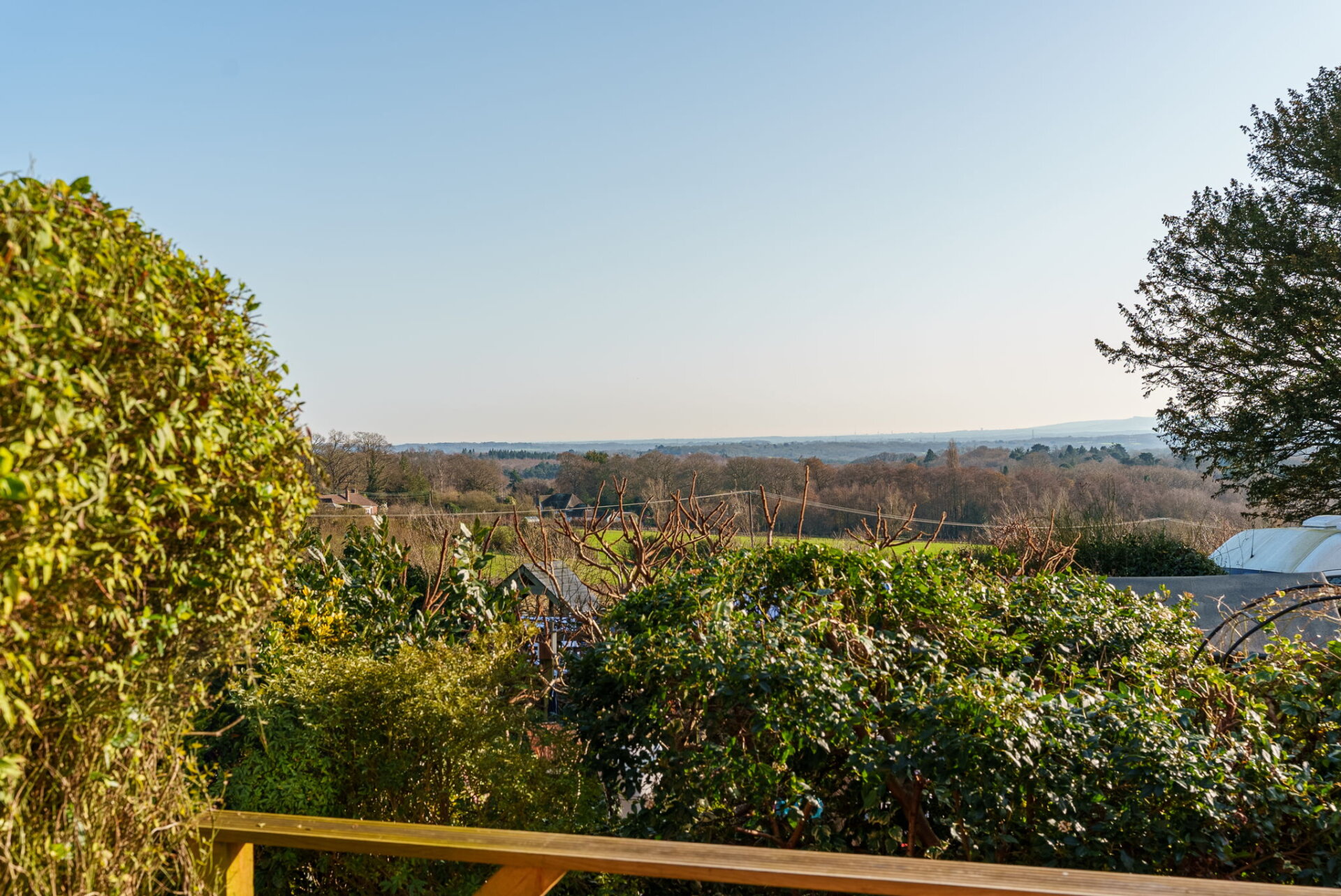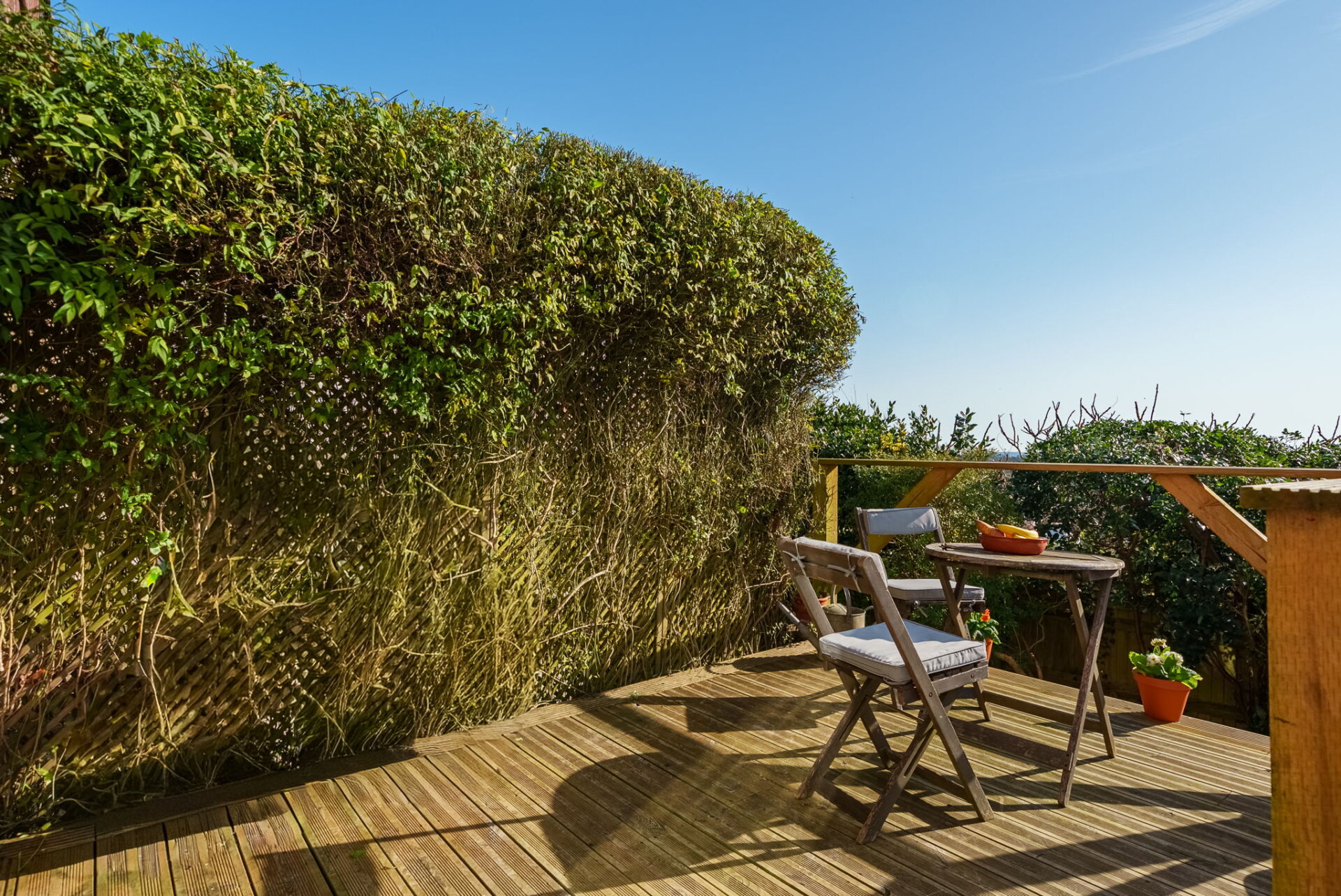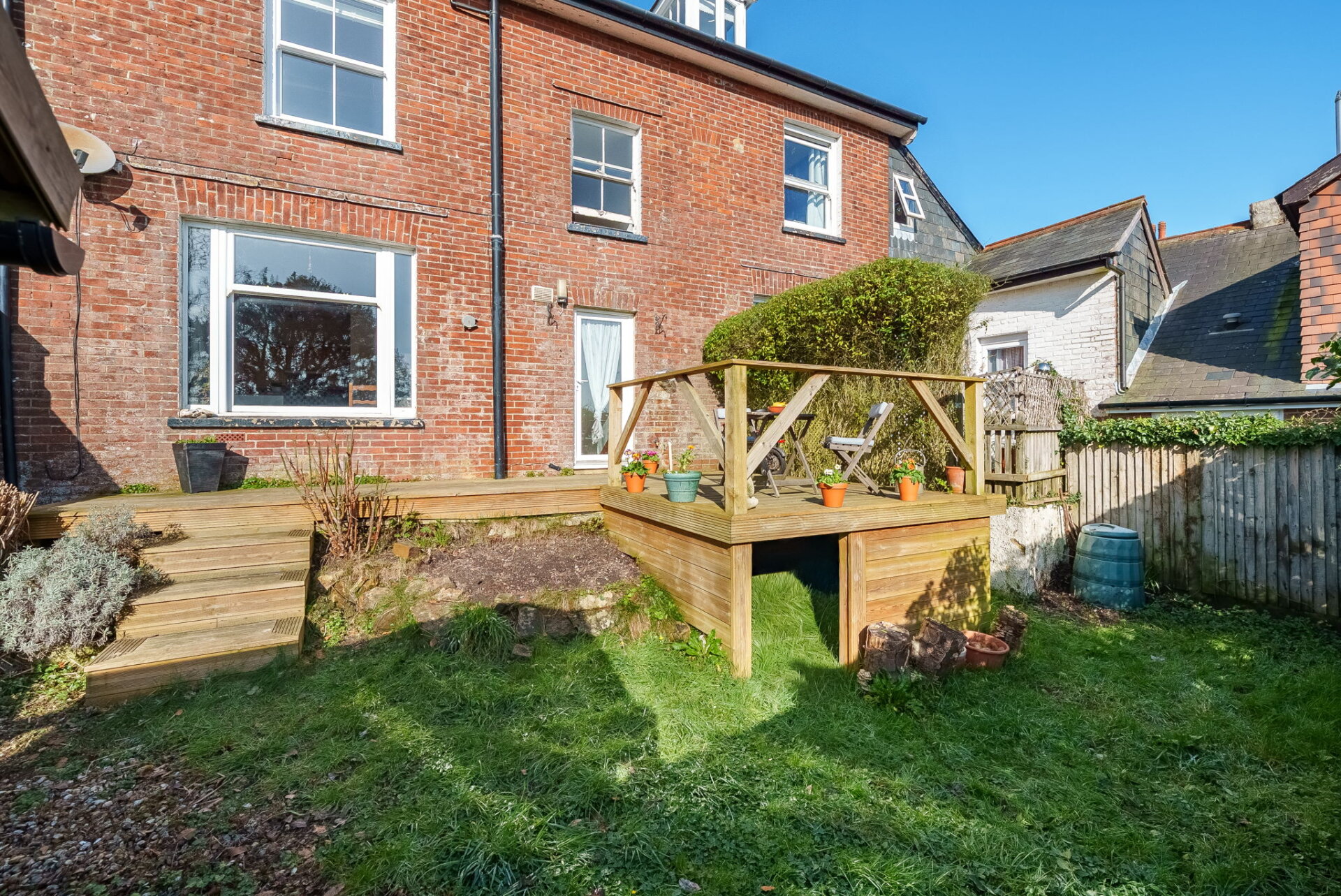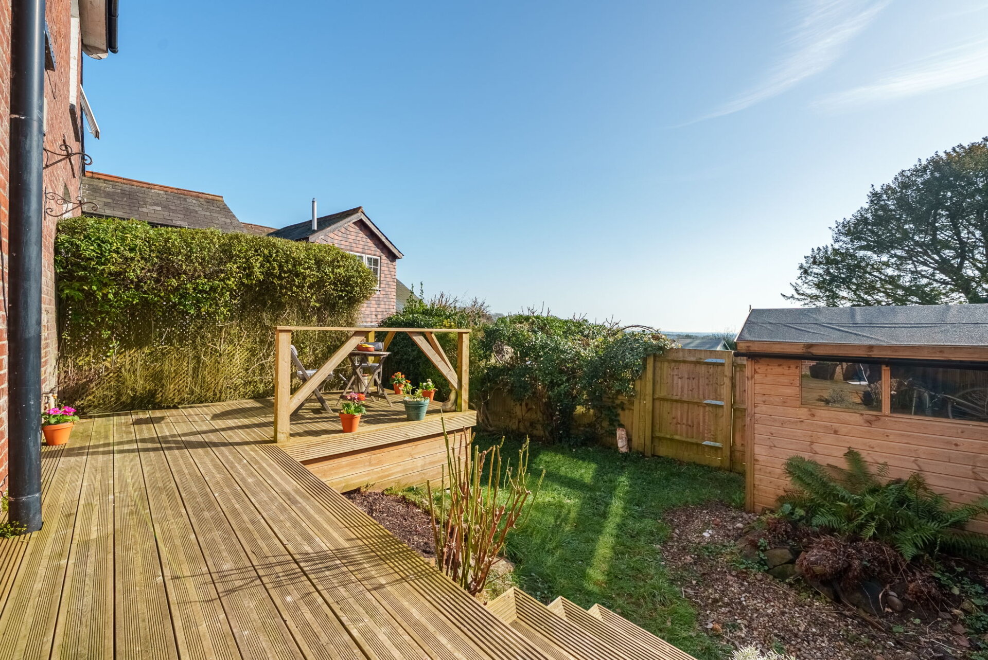 OutsideThe garden is accessed through patio doors from the living room, opening onto a decked area that was constructed within the last few years. This provides a lovely private spot for a table and chairs, ideal for relaxing or enjoying the views.