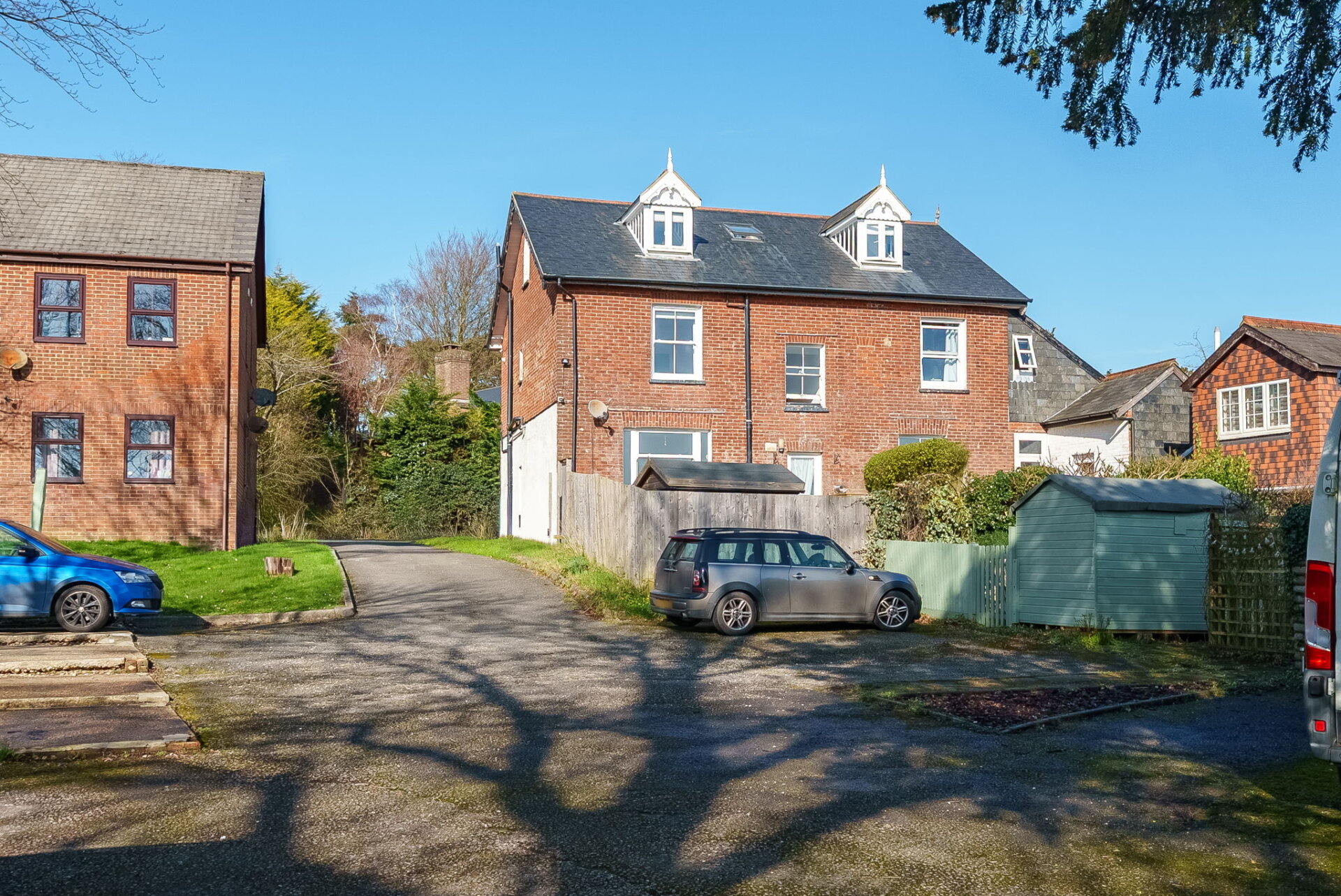 A good-sized shed provides useful storage for larger items such as tools and bicycles. At the rear of the garden, a gate leads directly to the parking area where there are two allocated parking spaces.