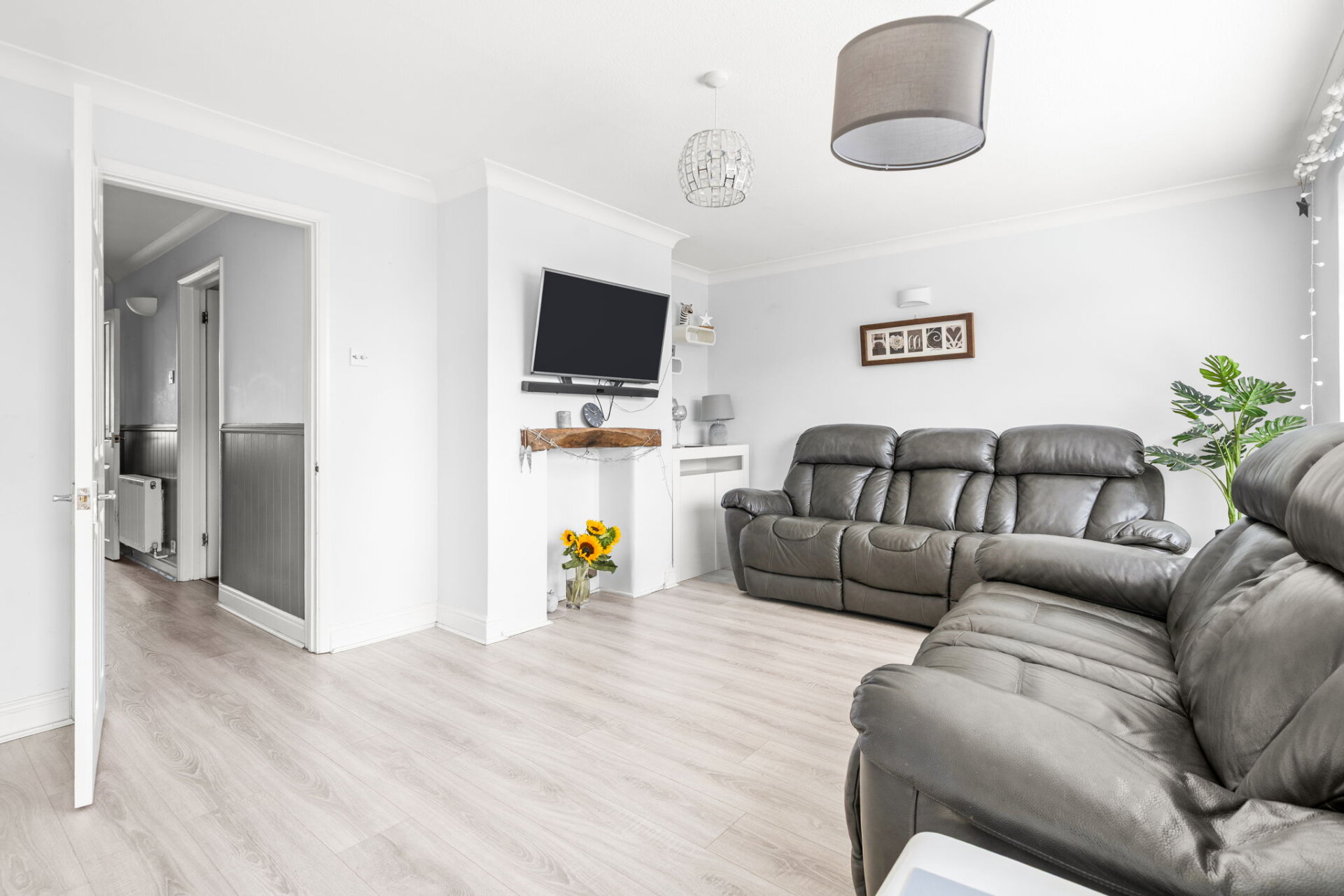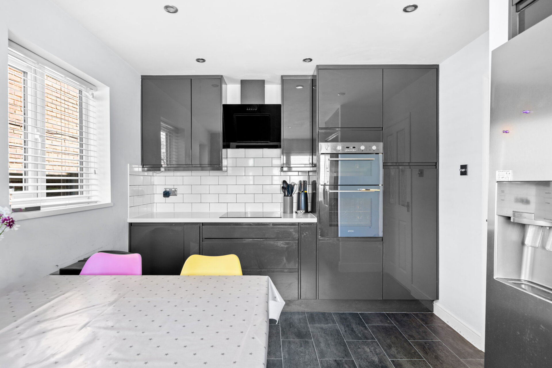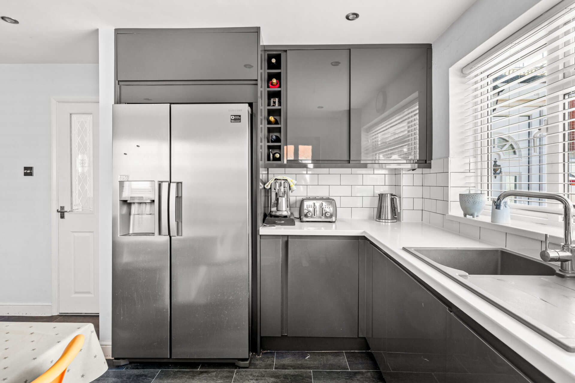 At the heart of the home is a contemporary kitchen-diner, featuring sleek fitted units, integrated appliances, and ample space for a large American-style fridge freezer. This sociable space is ideal for family mealtimes and entertaining.