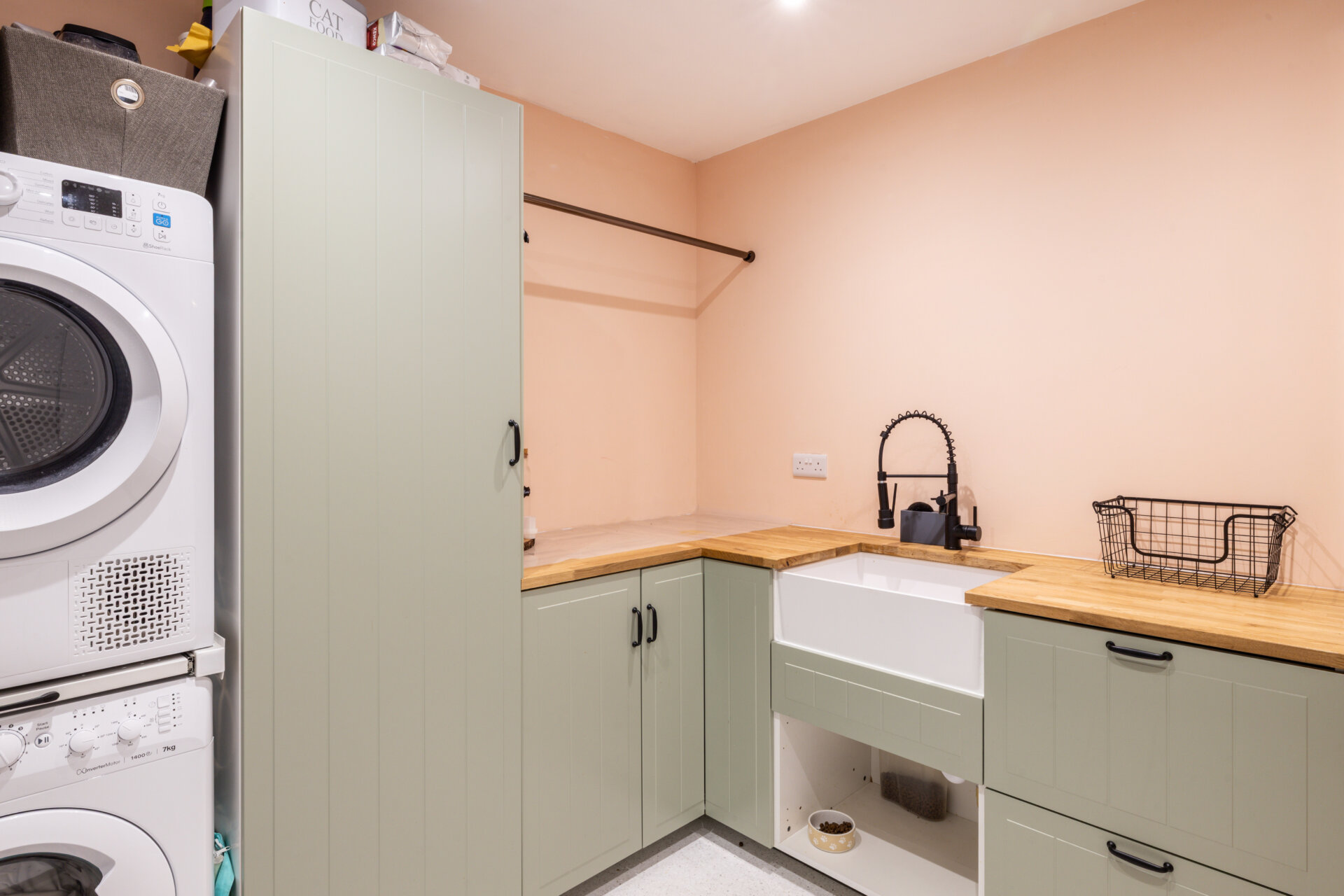 The main living accommodation is arranged across two floors and has been carefully designed with family living in mind. At the heart of the home is a contemporary and spacious open-plan kitchen, dining and family room — a sociable hub ideal for everyday life and entertaining alike. Just off the kitchen, the converted garage now provides a stylish utility room with sage green cabinetry, leading through to a superb cinema room, perfect for cosy movie nights or additional reception space. A ground-floor cloakroom adds further practicality.