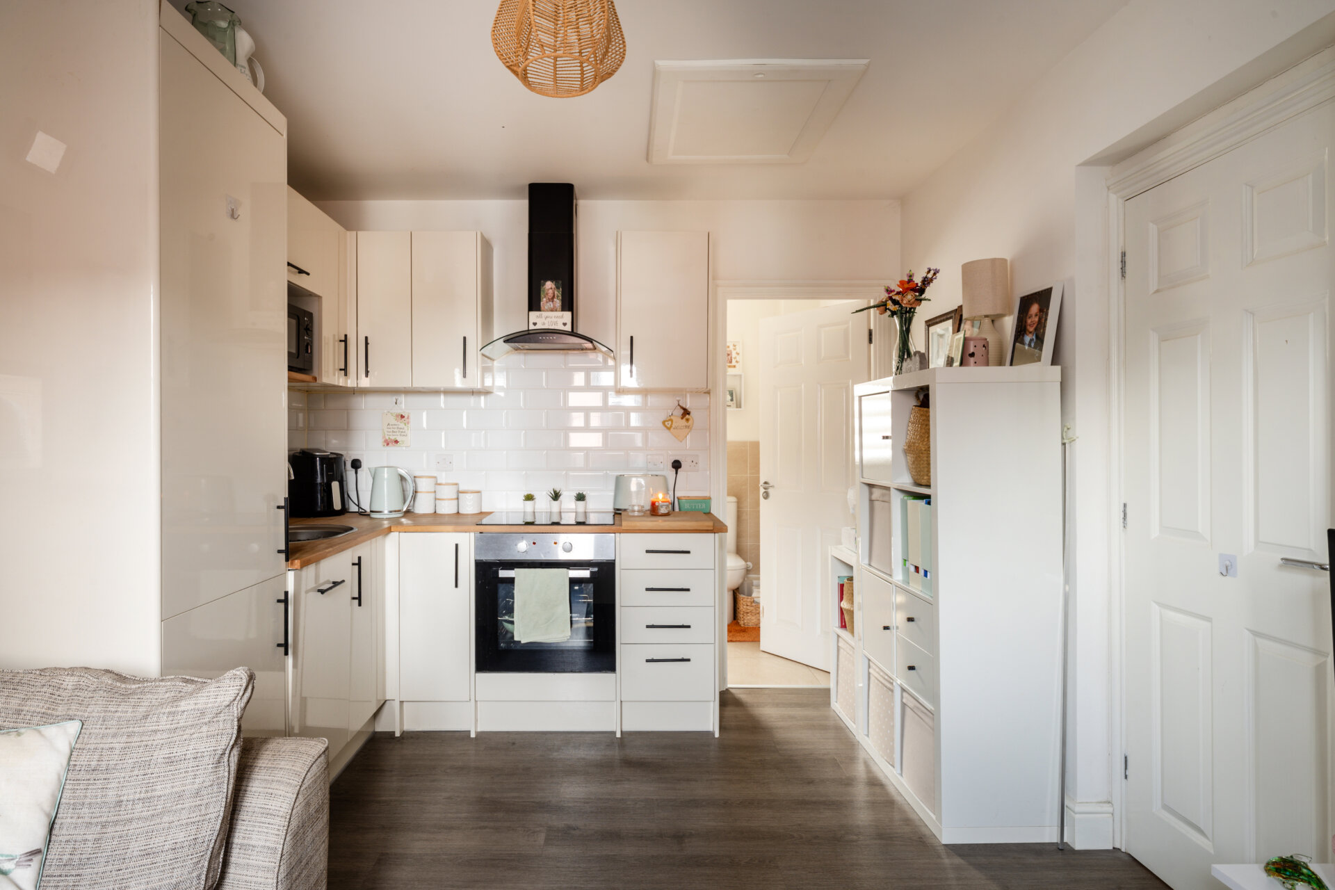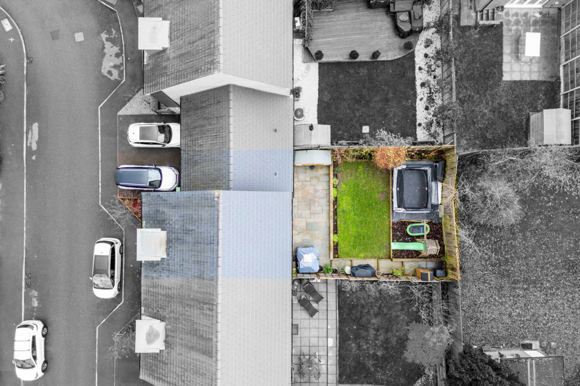 Outside, the rear garden is a real highlight — private, low maintenance and benefitting from a desirable south-facing aspect. With lawn and patio areas plus rear access, it’s ideal for outdoor dining, children at play or relaxed summer evenings. To the front, a private driveway provides off-road parking, with additional visitor bays conveniently located nearby.