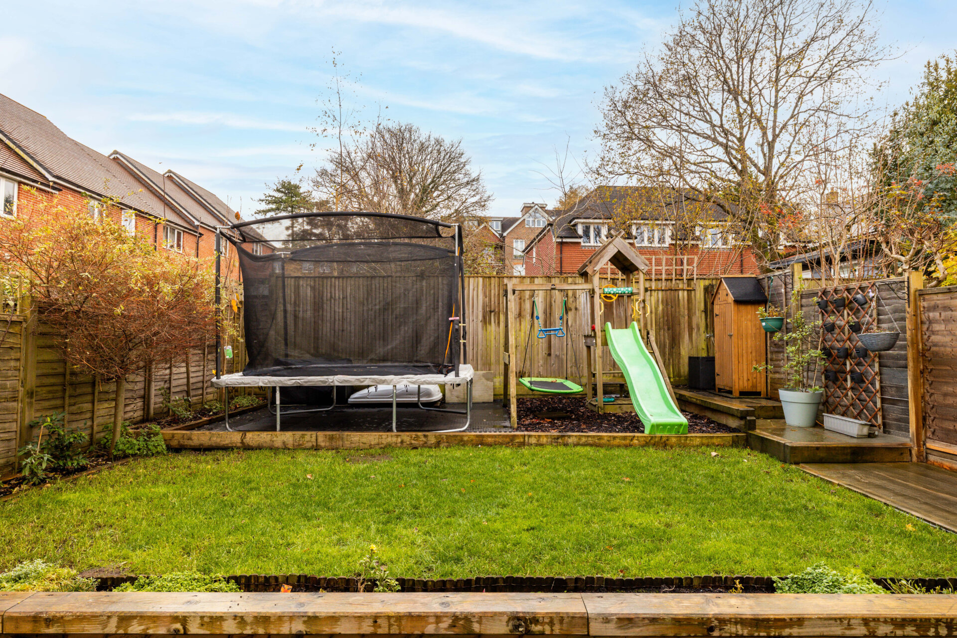 On the first floor, a generous and light-filled living room enjoys patio doors opening directly onto the sunny south-facing garden, creating a seamless connection between indoor and outdoor living. This level also hosts the fourth bedroom and a family bathroom.
