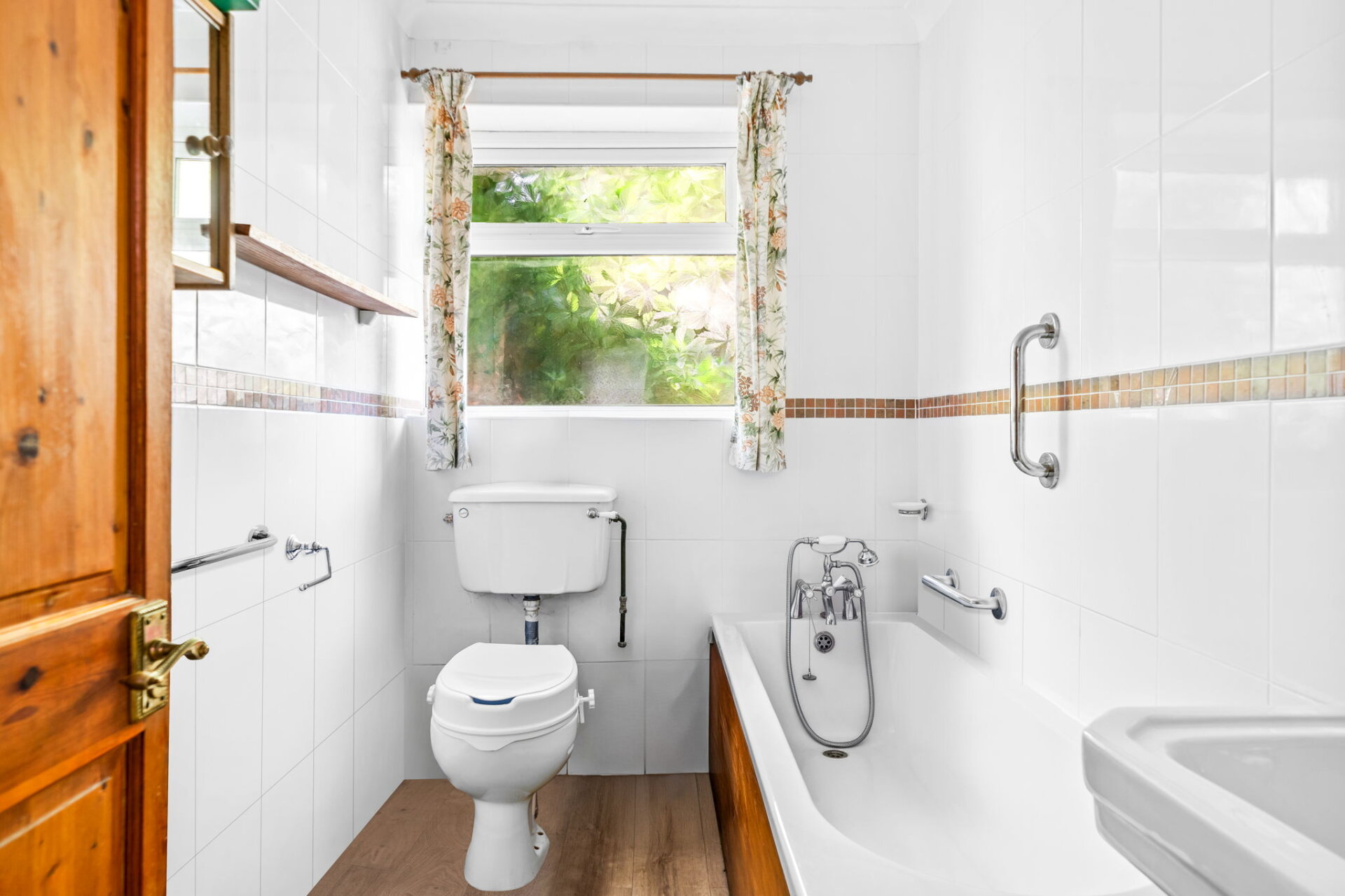 The family bathroom includes a traditional bath with handheld shower, basin, and WC. While functional, the space is ready for updating.