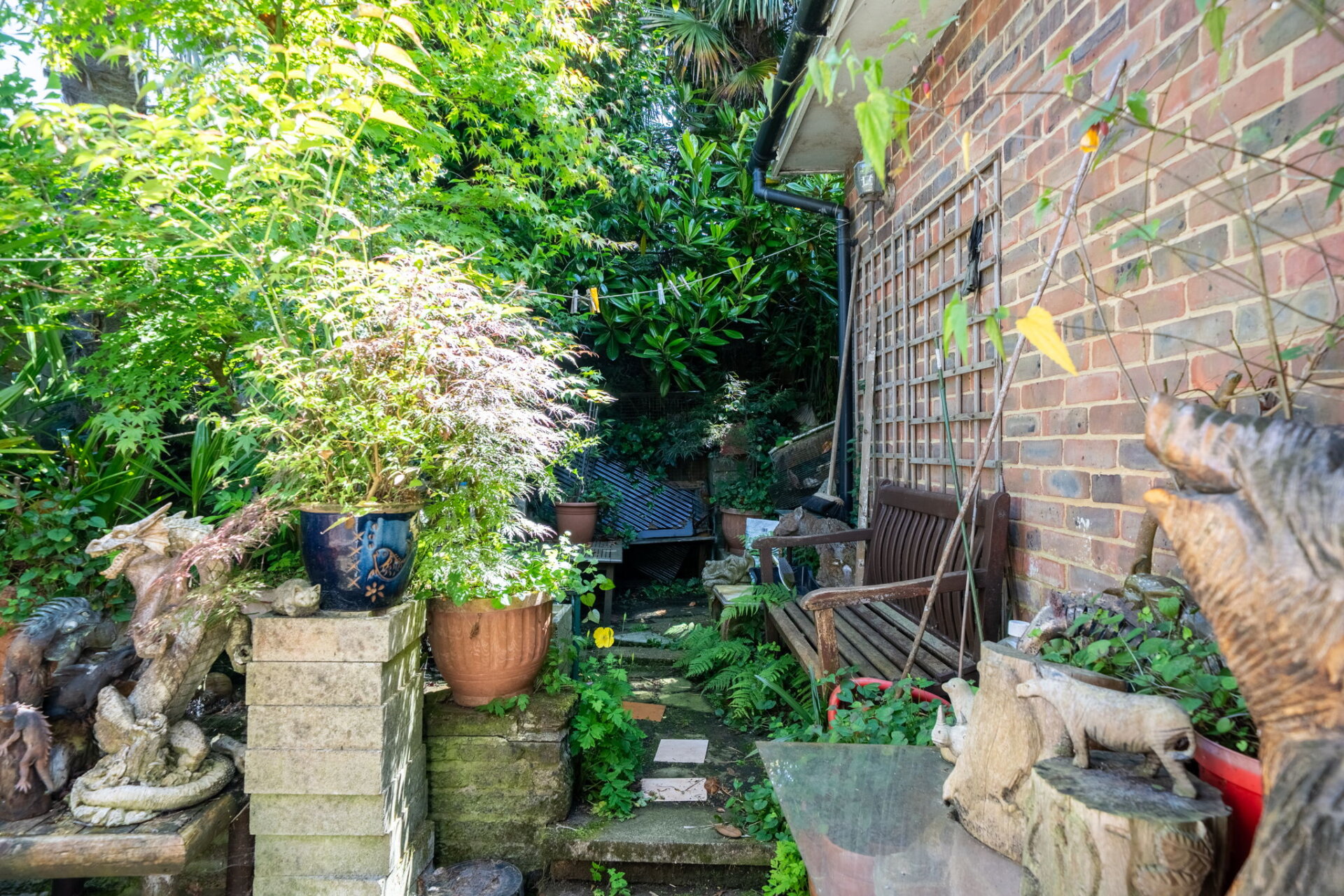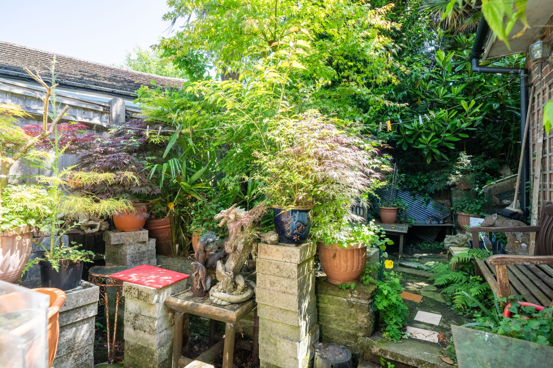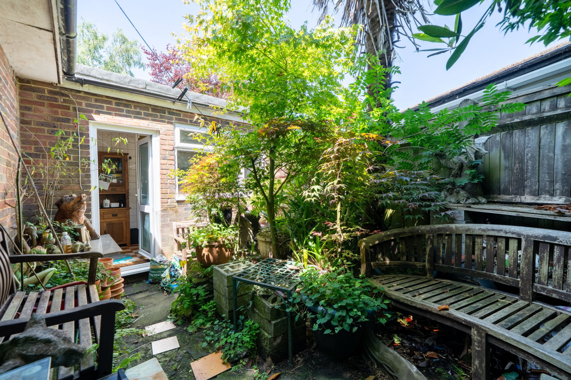 The garden wraps around the property, offering a good amount of outdoor space with plenty of potential. Currently in need of some general tidying and attention, it’s stocked with a variety of mature trees and plants — including Acers and palms — which, once cared for, could create a wonderfully private and secure garden environment.