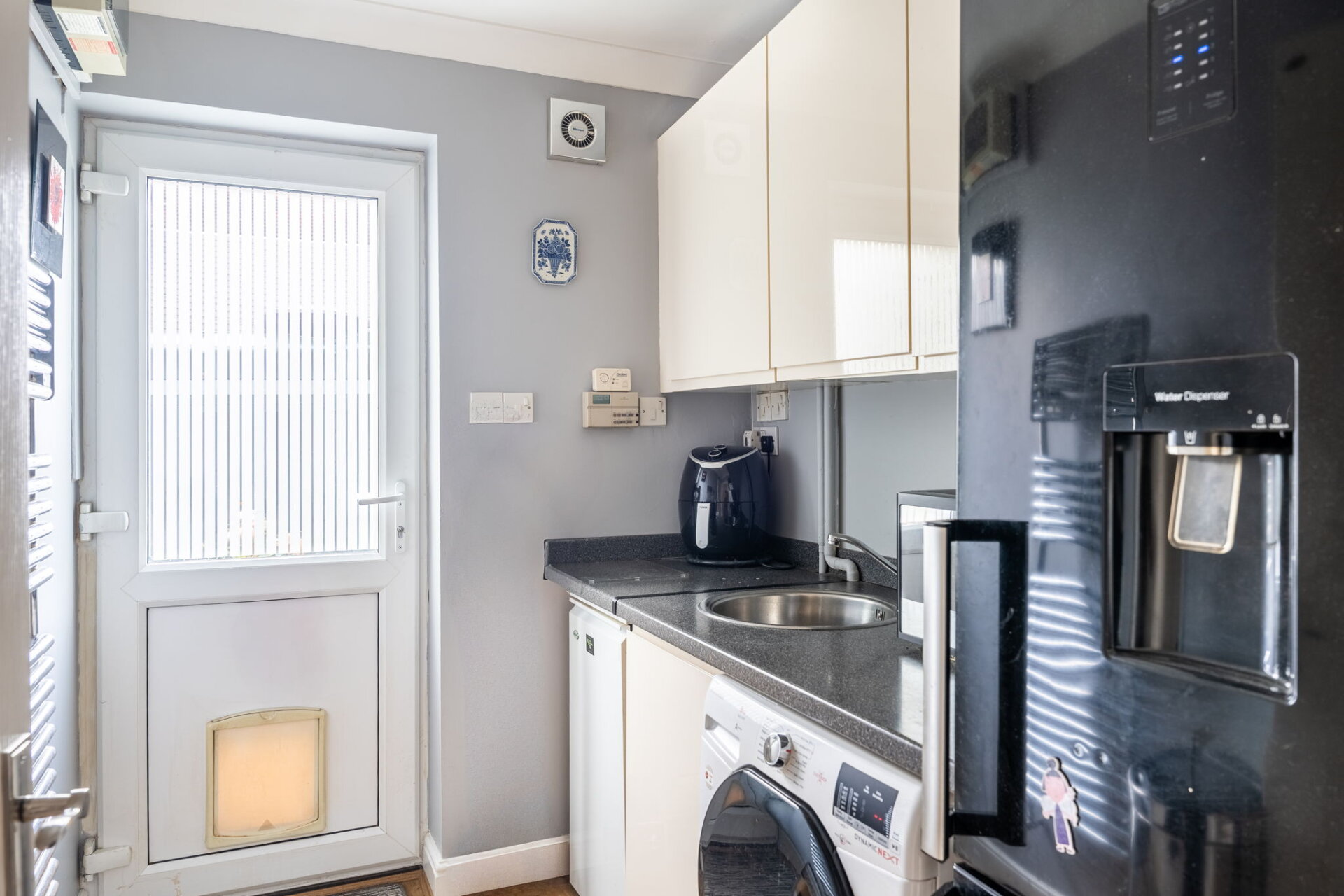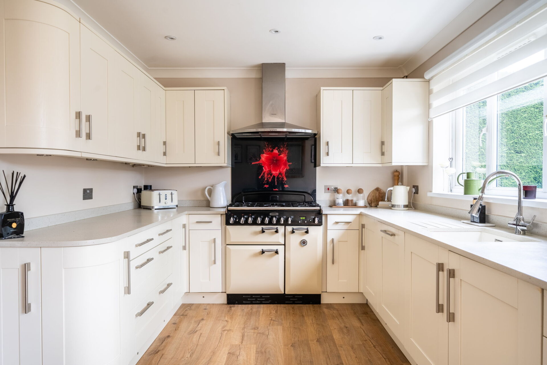 The kitchen is a generous size and well-equipped, featuring a fitted range cooker and integrated fridge. A separate utility area with space for washing machine , additional fridge freezer or tumble dryer.