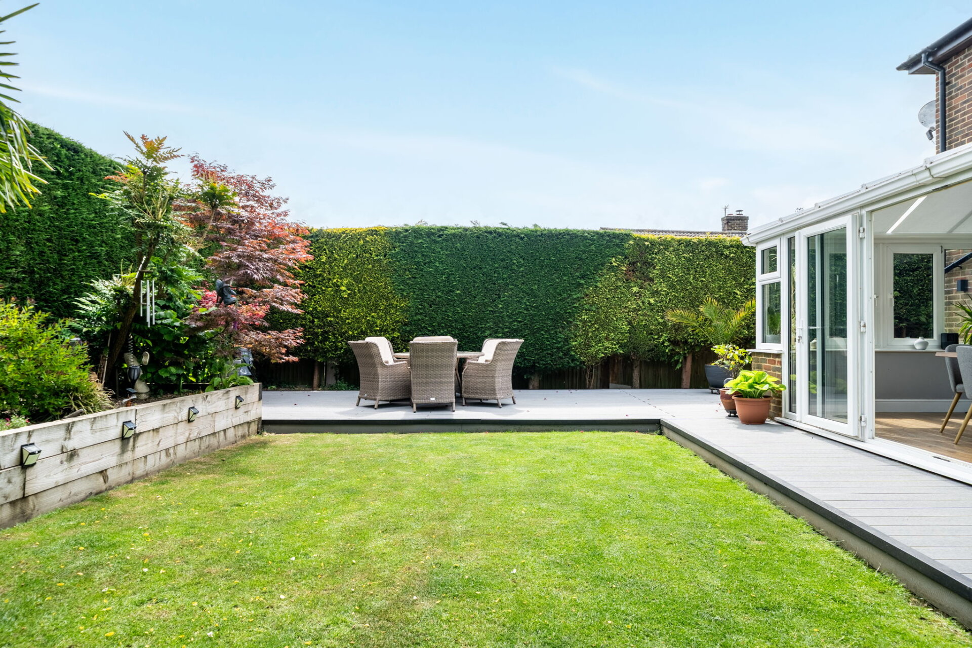 The garden is a true highlight of the property, beautifully maintained lawn surrounded by raised flower beds bursting with a diverse variety of seasonal plants and flowers. Composite decking runs around the edges, leading to a generous decked entertaining area — perfect for dining al fresco, relaxing with family, or hosting friends throughout the seasons.