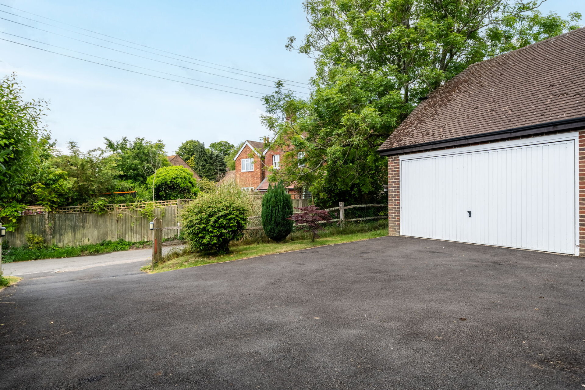 To the front, a large driveway provides ample parking for multiple vehicles, complemented by a detached garage.