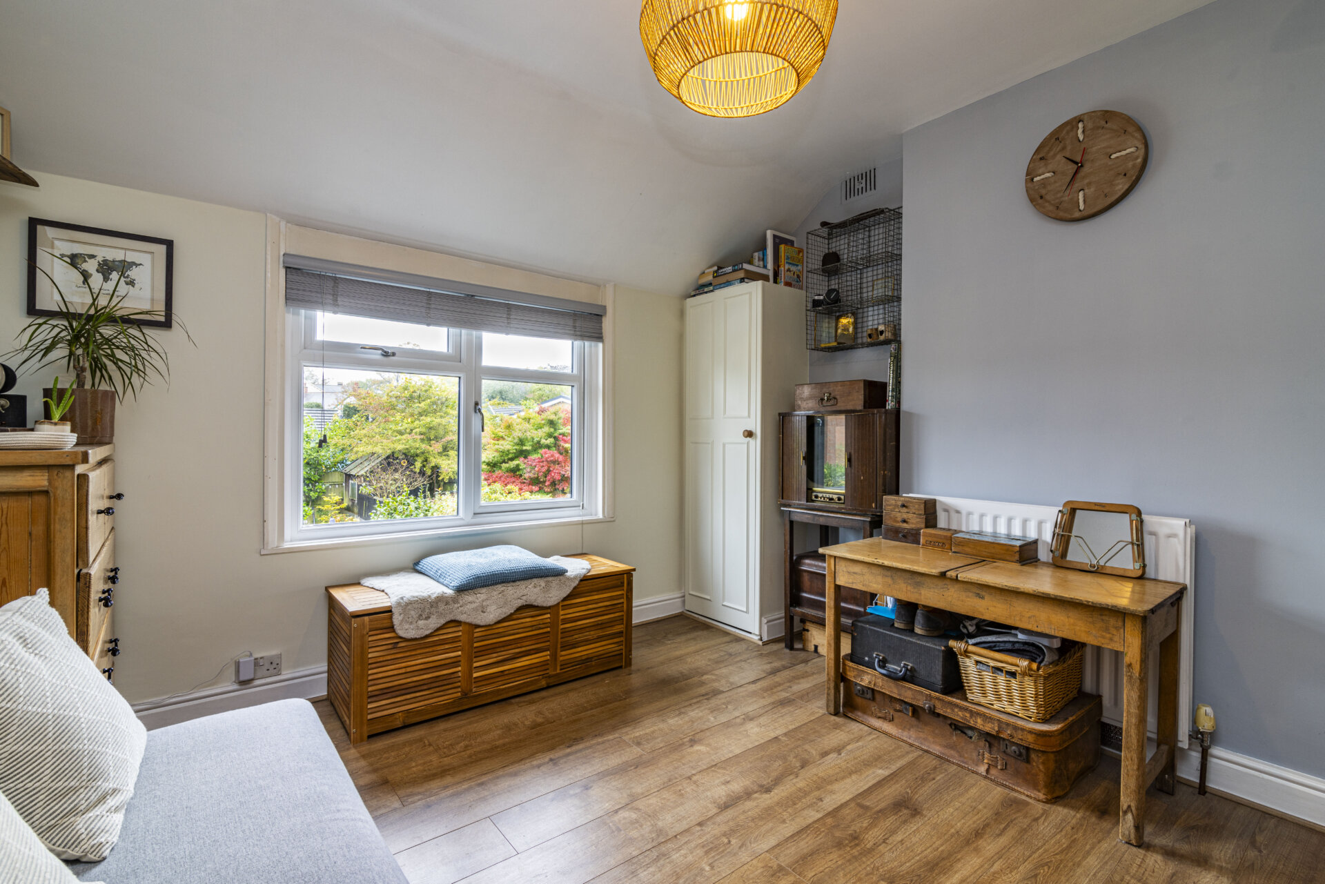 Upstairs, the two spacious double bedrooms provide ample comfort. The master bedroom, situated at the front of the home, includes convenient storage space, while the second bedroom at the rear offers serene views of the garden, making it a great guest bedroom, or home office, or both.