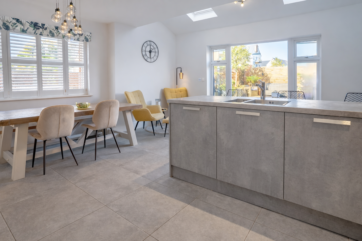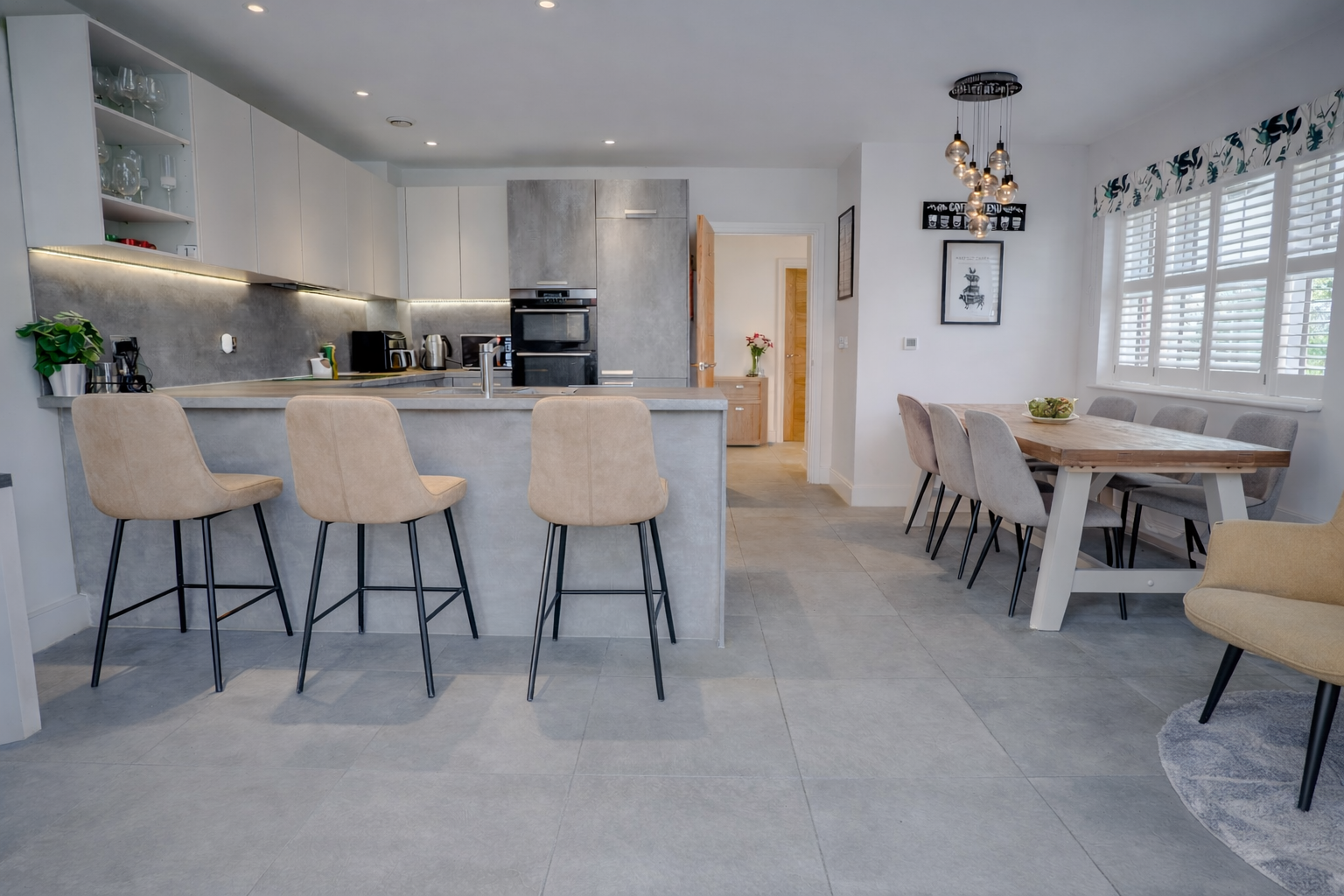 Built in 2018, the property opens into a bright entrance hall leading through to a stylish sitting room with a newly installed wood burner and bespoke shutters. At the rear, the spacious kitchen-dining room forms the heart of the home, featuring integrated appliances, a breakfast bar, and French doors that open directly onto the garden, ideal for everyday living or entertaining.