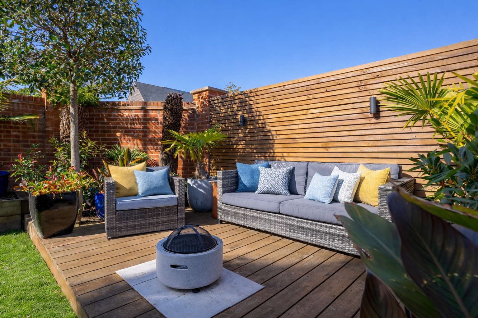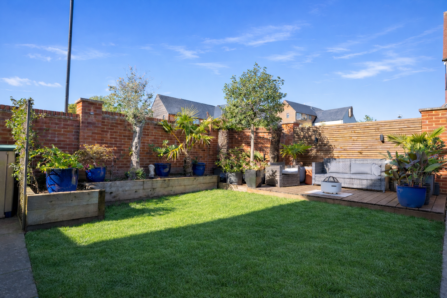 Outside, a driveway for two vehicles leads to a powered garage with storage and an EV charging point. The private, part-walled garden measures approximately 26 ft × 26 ft and enjoys a sunny aspect, with a paved patio, lawn, and raised borders, ideal for relaxed outdoor dining or play.