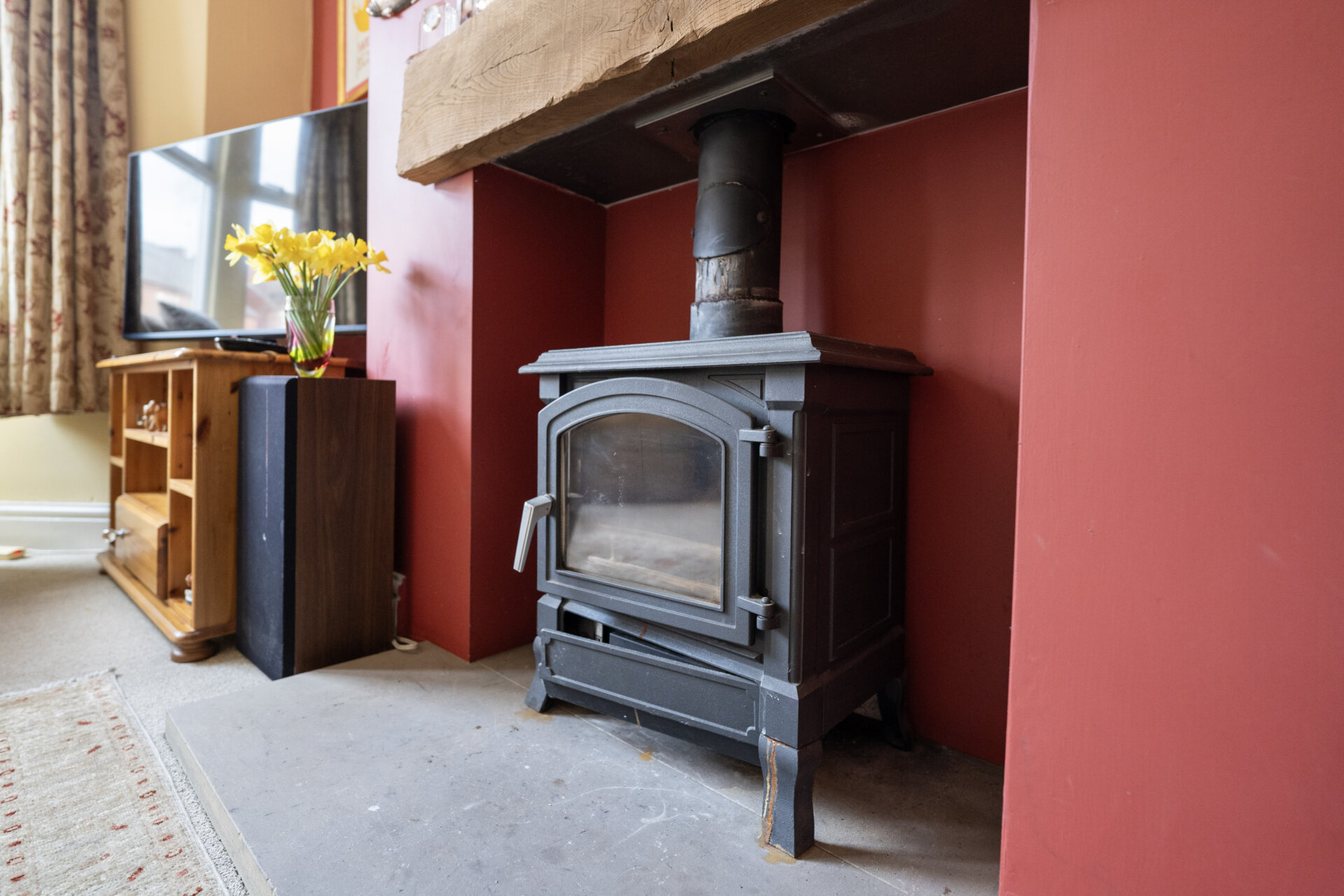 Spacious front lounge room with large double glazed bay window to the front elevation, chimney breast with inset featuring a log burner with recess alcoves to both sides , carpet flooring and radiator.