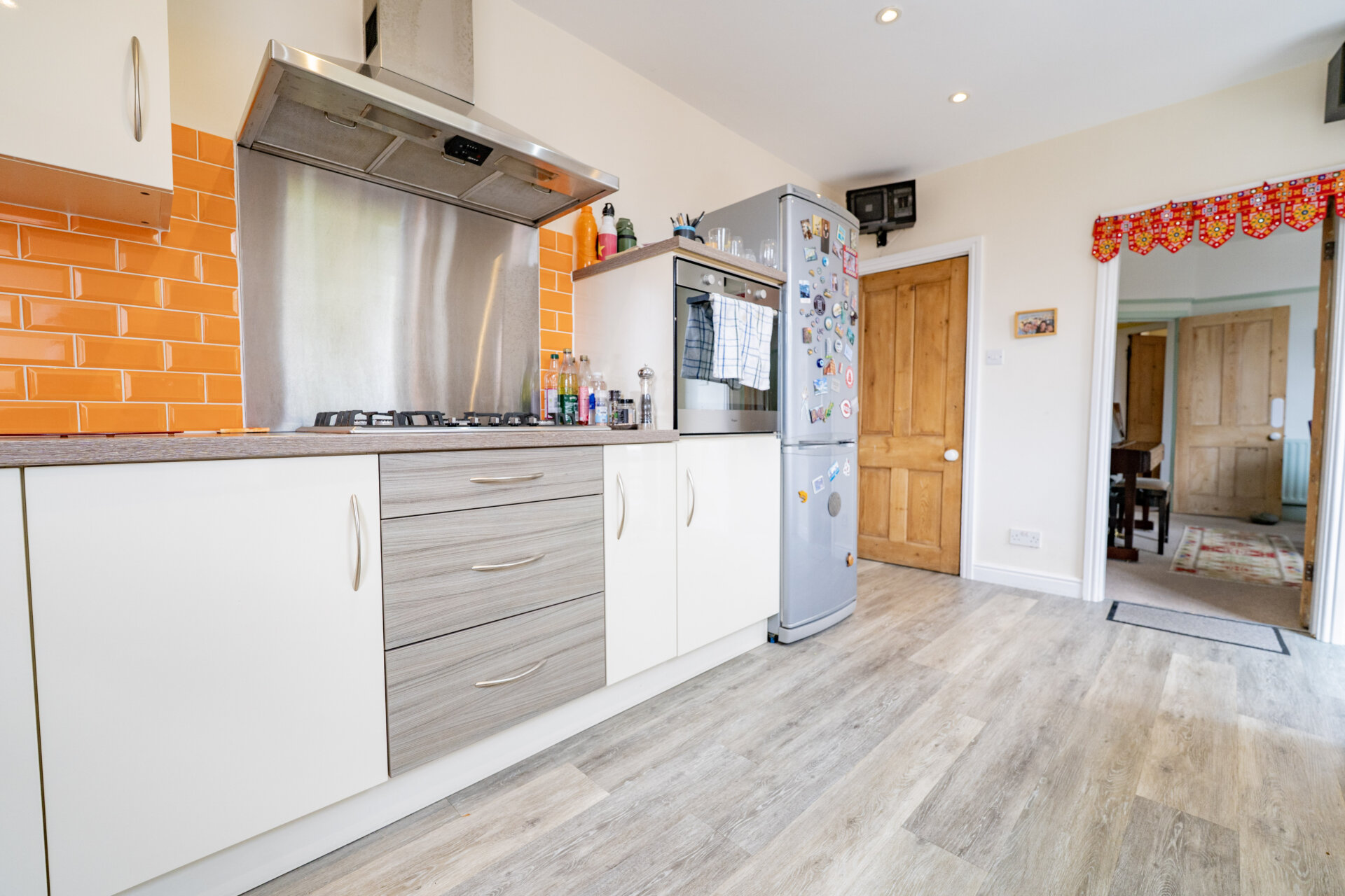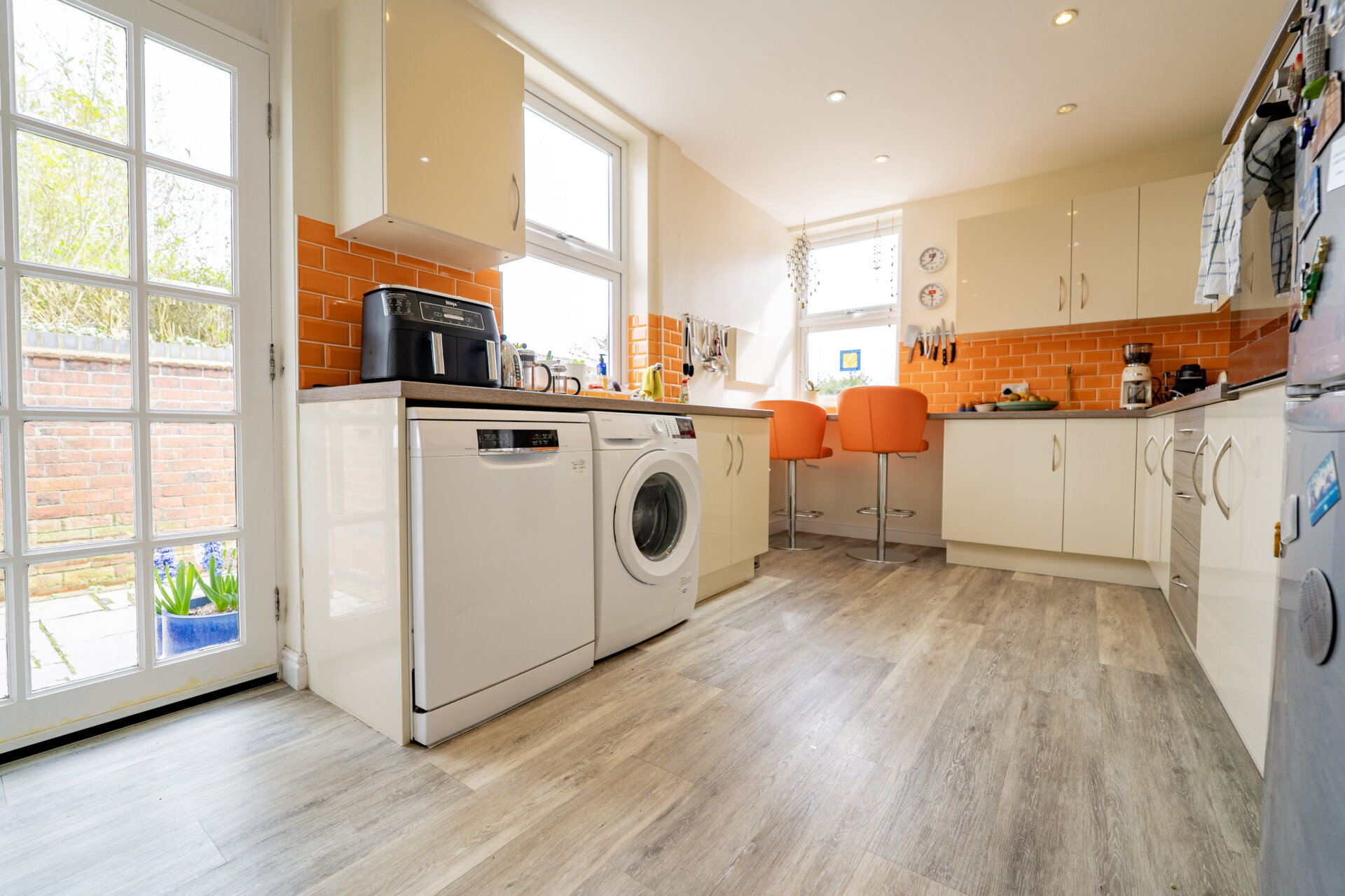 Kitchen with a range of wall and base units square top work surfaces, tiled splashbacks, standing height oven and grill, space for fridge freezer, washing machine and dishwasher, one and a half bowl sink and drainer with mixer tap, breakfast bar, under stair storage and cloaks, double glazed windows to the left and rear elevation and door leading to the patio area.