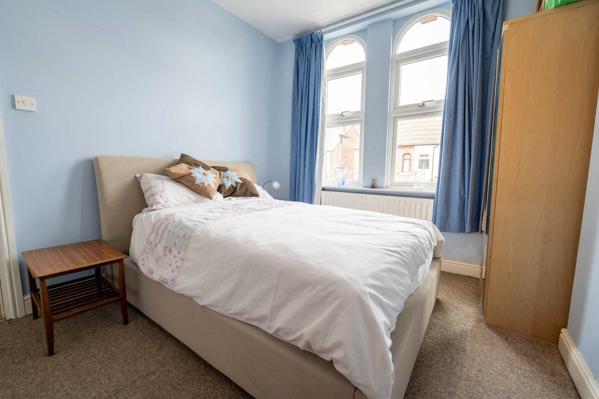 Another double bedroom with continued high ceilings, chimney breast with recess alcoves either side, two double glazed arch windows to the front elevation, carpet flooring and radiator.