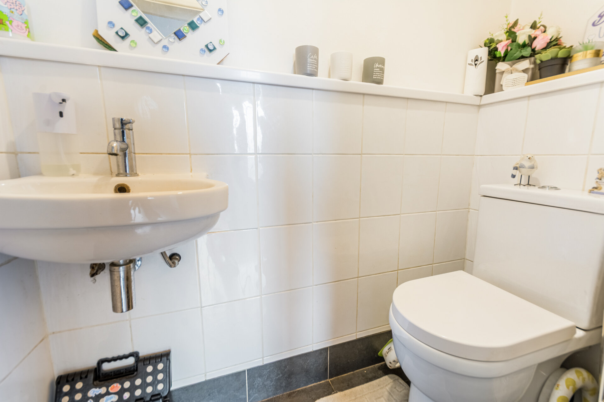 Claoks, wc comprising of a low flush wc, floating wash hand basin, tiled half walls.