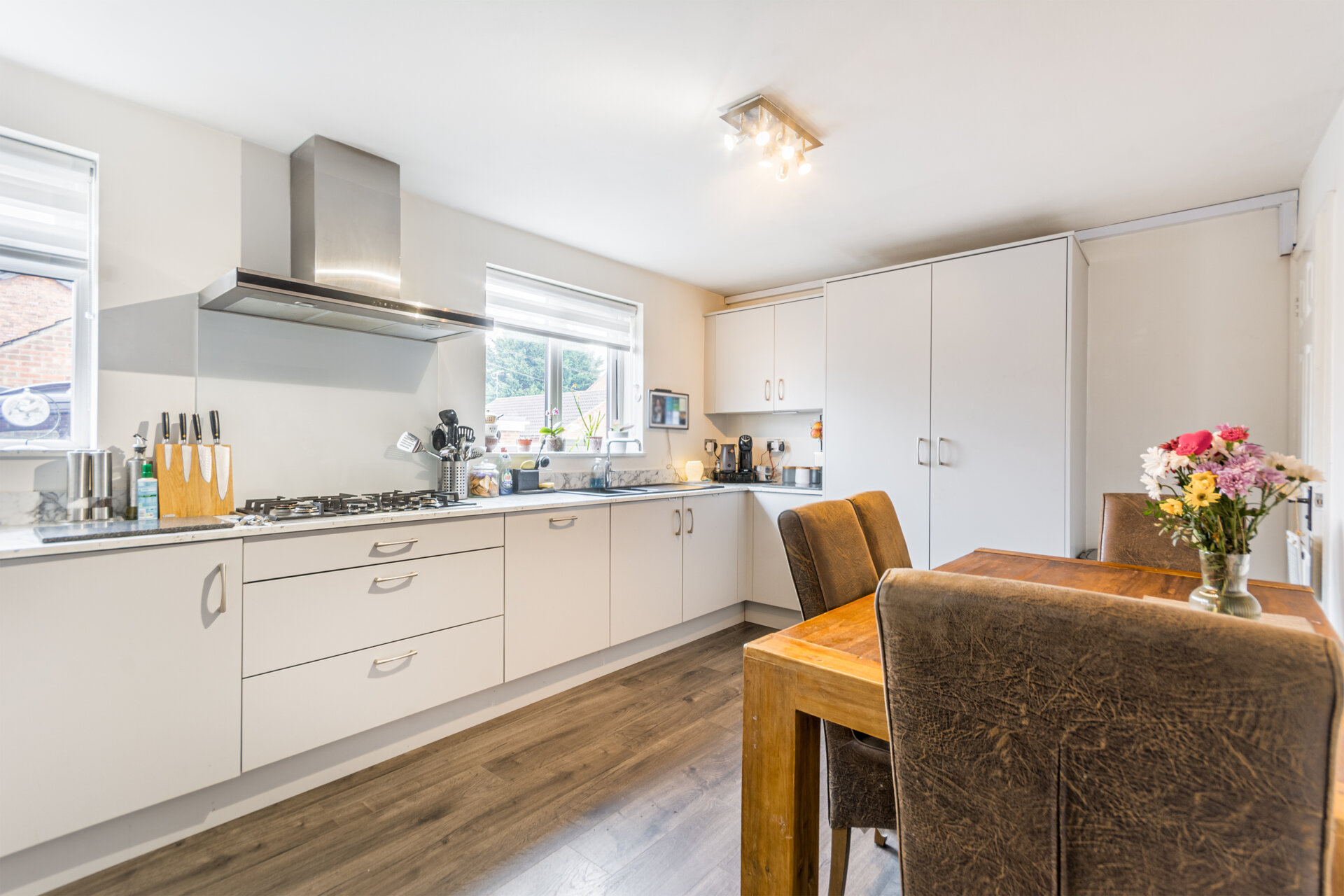 A beautifully updated kitchen diner with wall and base units incorporating cupboards, draws and pantry cupboard, one and a half bowl sink and drainer with 'Quooker' tap integrated full length fridge and freezer, standing height oven, grill and microwave, integrated dishwasher, inset five ring gas hobs with extractor hood, two double glazed windows to the front elevation, under the stairs storage cupboard and area for dining table.