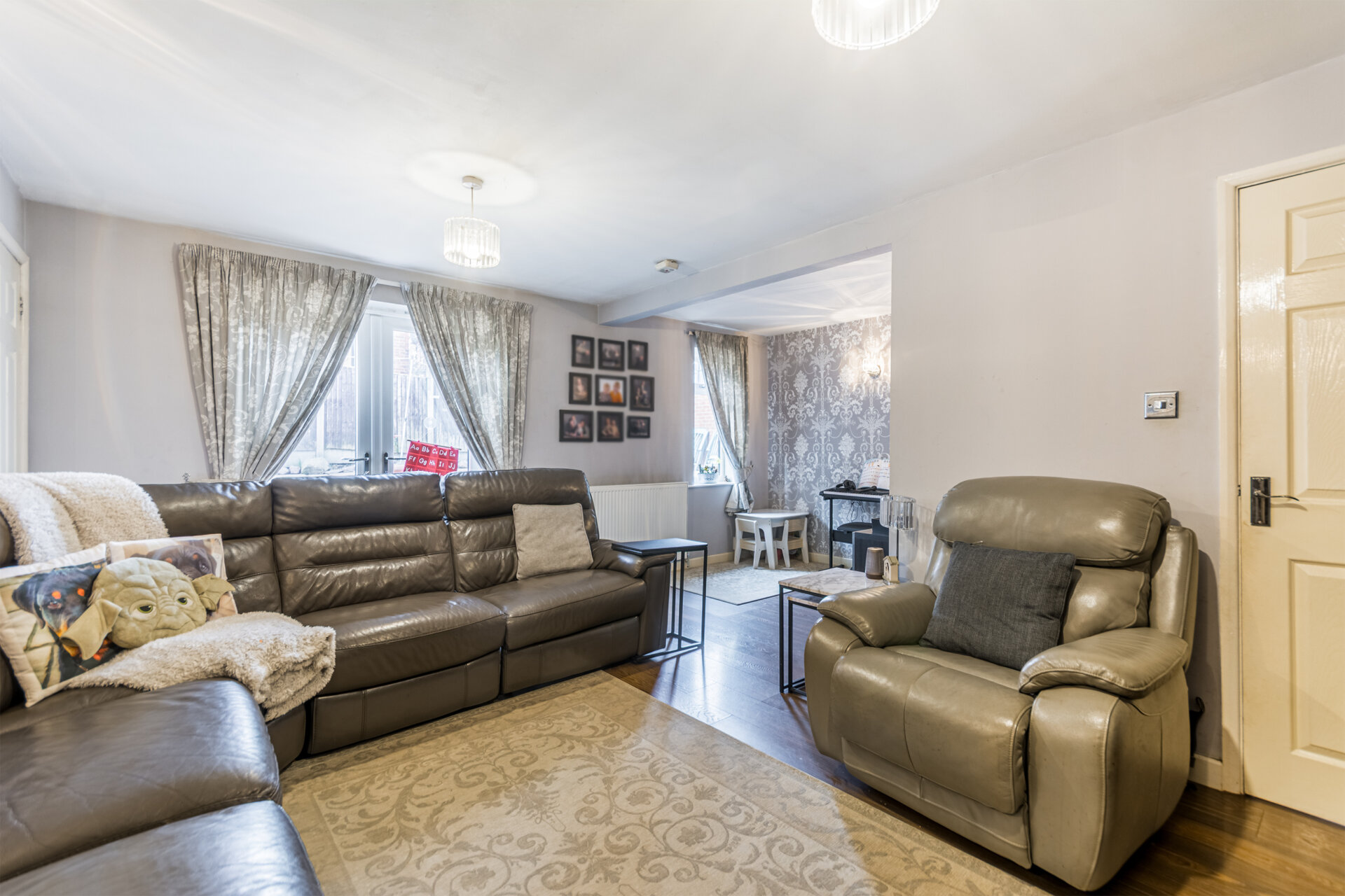 A great size lounge with wood effect flooring, radiator and double glazed patio door to the rear, open to the dining space.