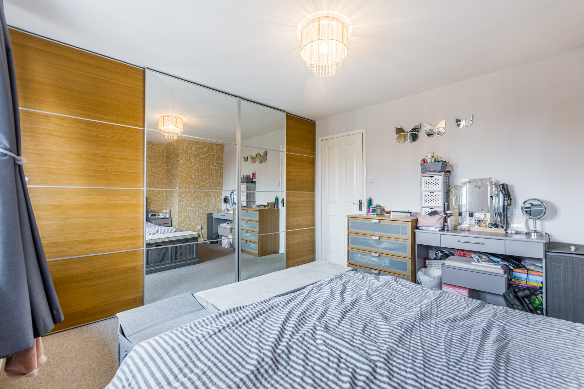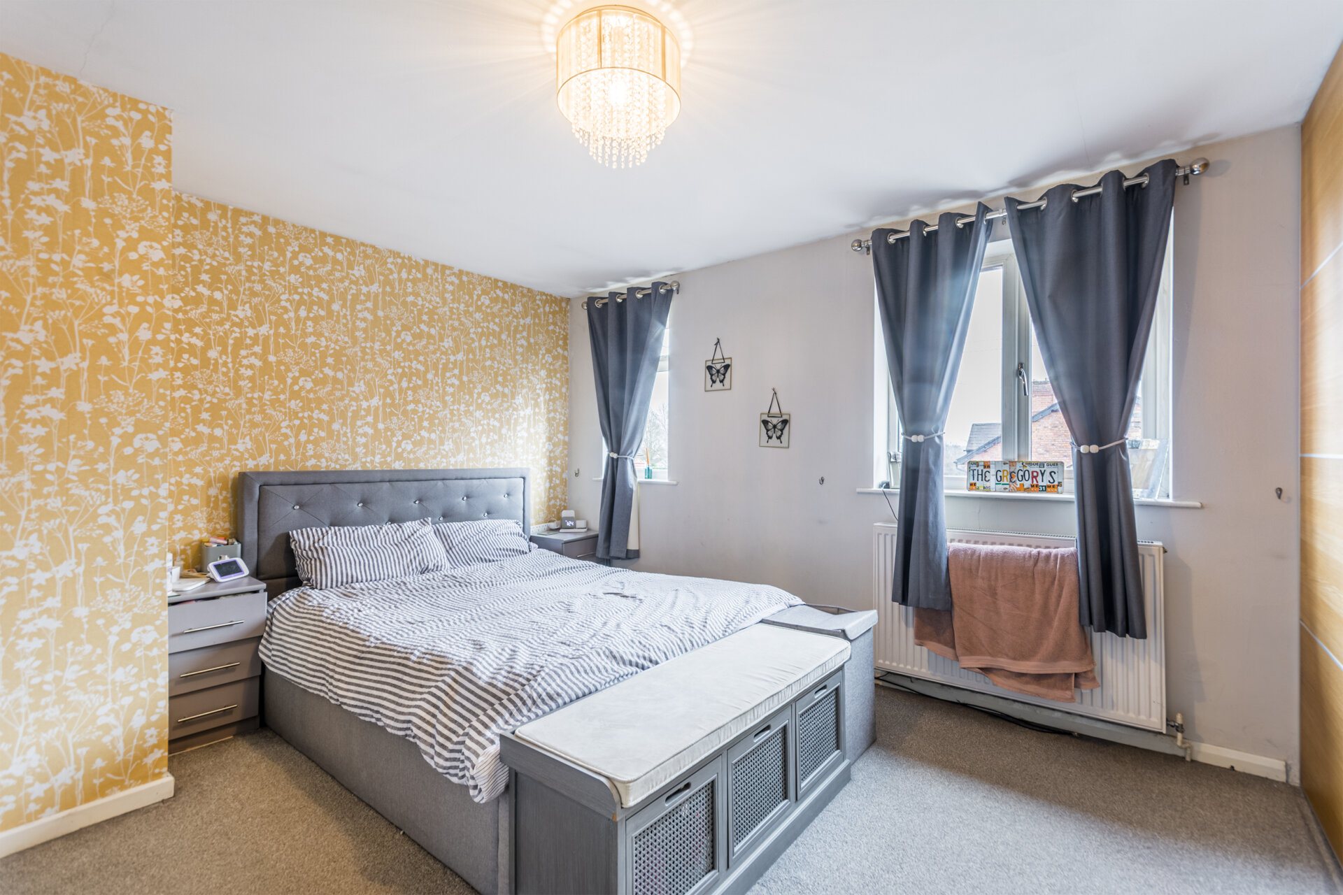 A superb size main bedroom with two double glazed windows to the front elevation, carpet flooring, radiator, large sliding wardrobes along one wall.