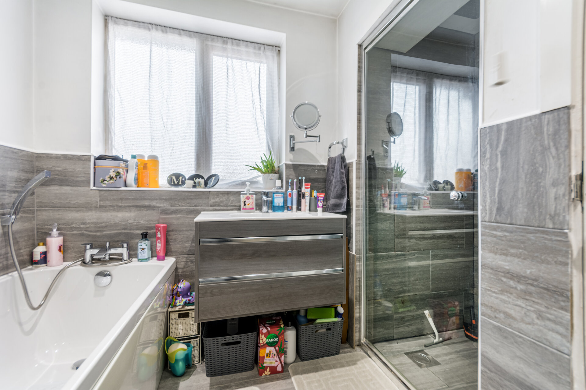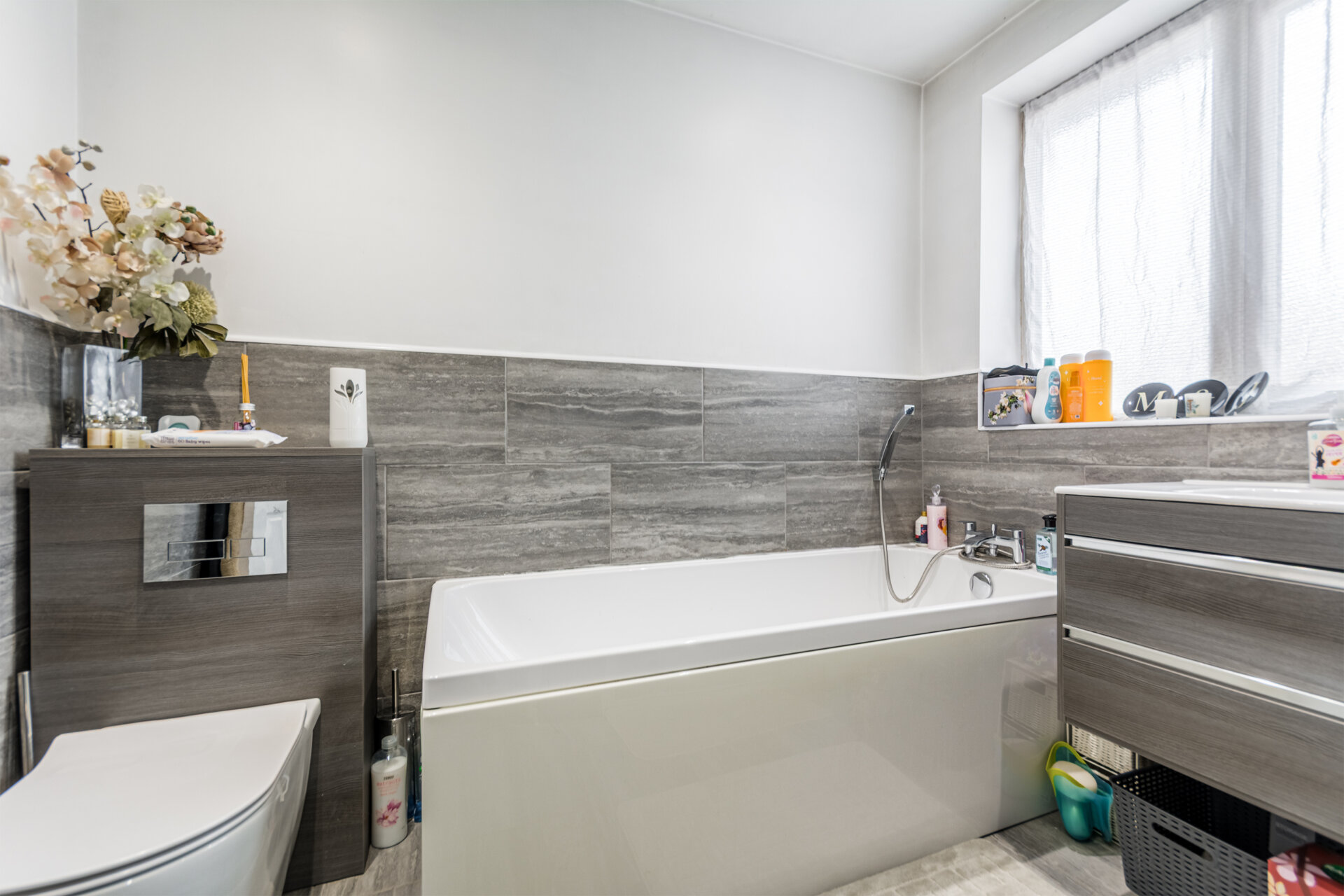 A modern refitted four piece bathroom suite comprising of a panelled bath with mixer shower over, tiled splash backs, floating vanity unit with wash hand basin, low flush wc and recess incorporating walk in shower with waterfall shower and mixer with glass privacy door, opaque double glazed window to the front elevation to the front.