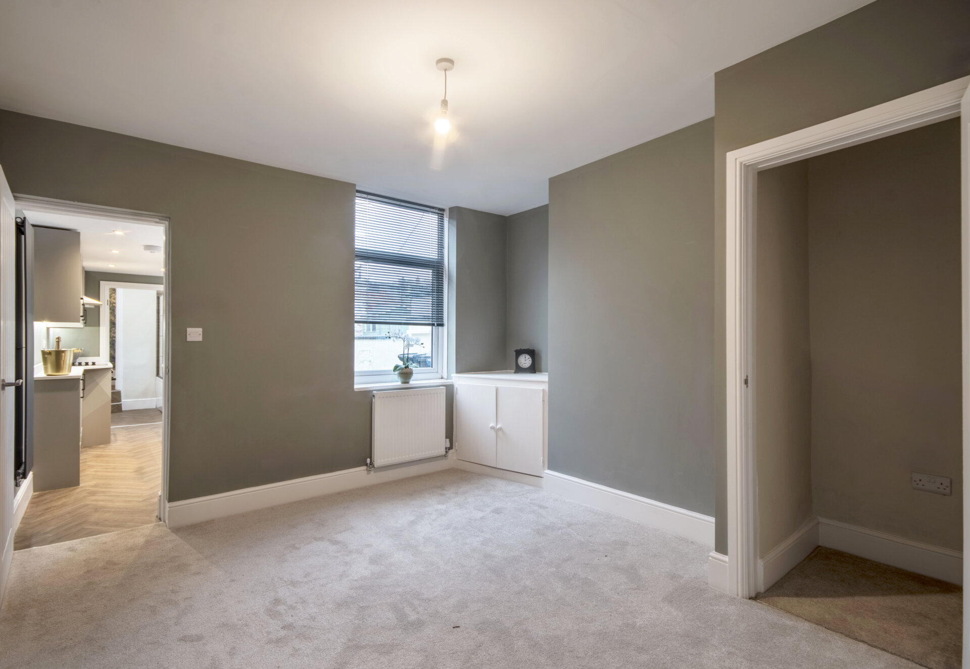 New refitted bedroom with new carpet, radiator, double glazed window to the rear and cupboard for storage also housing the combination boiler.