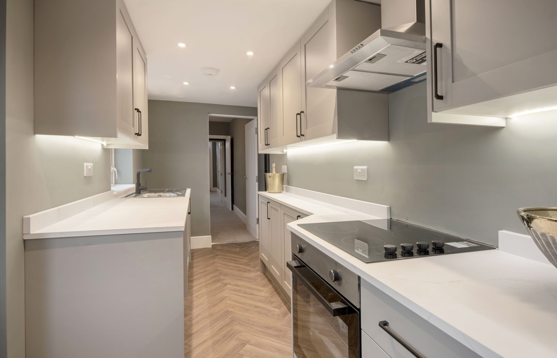 A stunning new refitted kitchen with a range of wall and base units, square top work services, space for washing machine , dryer and fridge freezer, integrated electric oven and electric hobs with extractor, modern vertical radiator, sink and drainer with mixer tap, double glazed window to the right elevation, gorgeous wood effect flooring and double glazed door to the right elevation and door to bathroom.