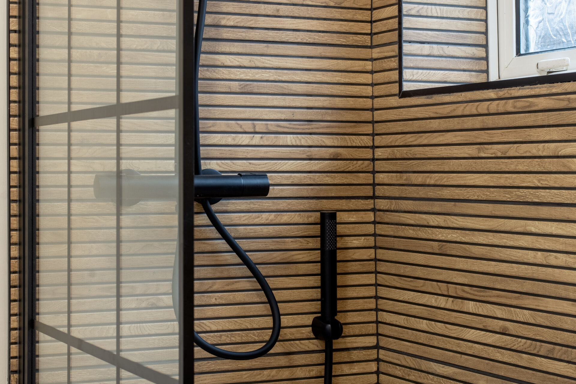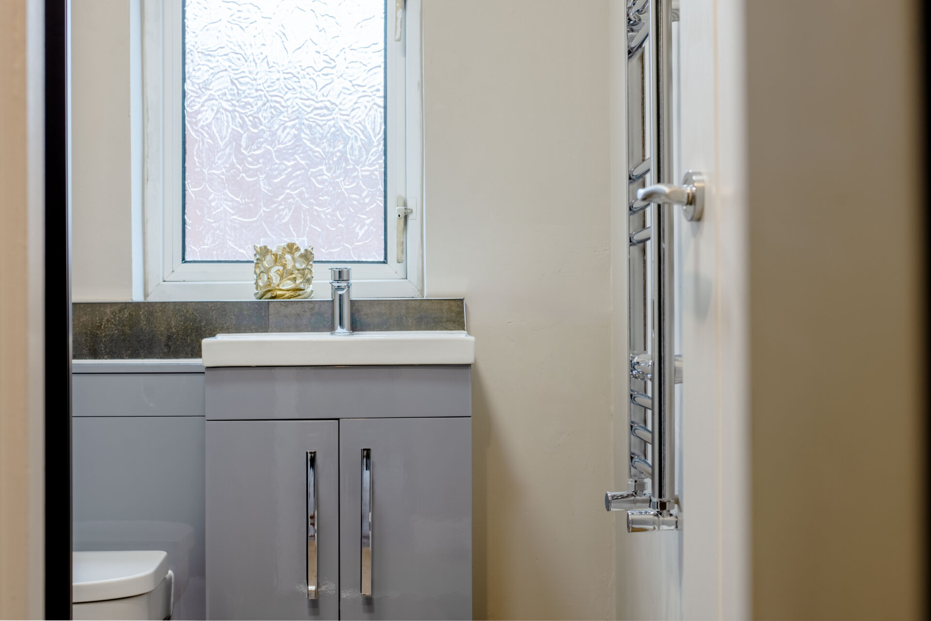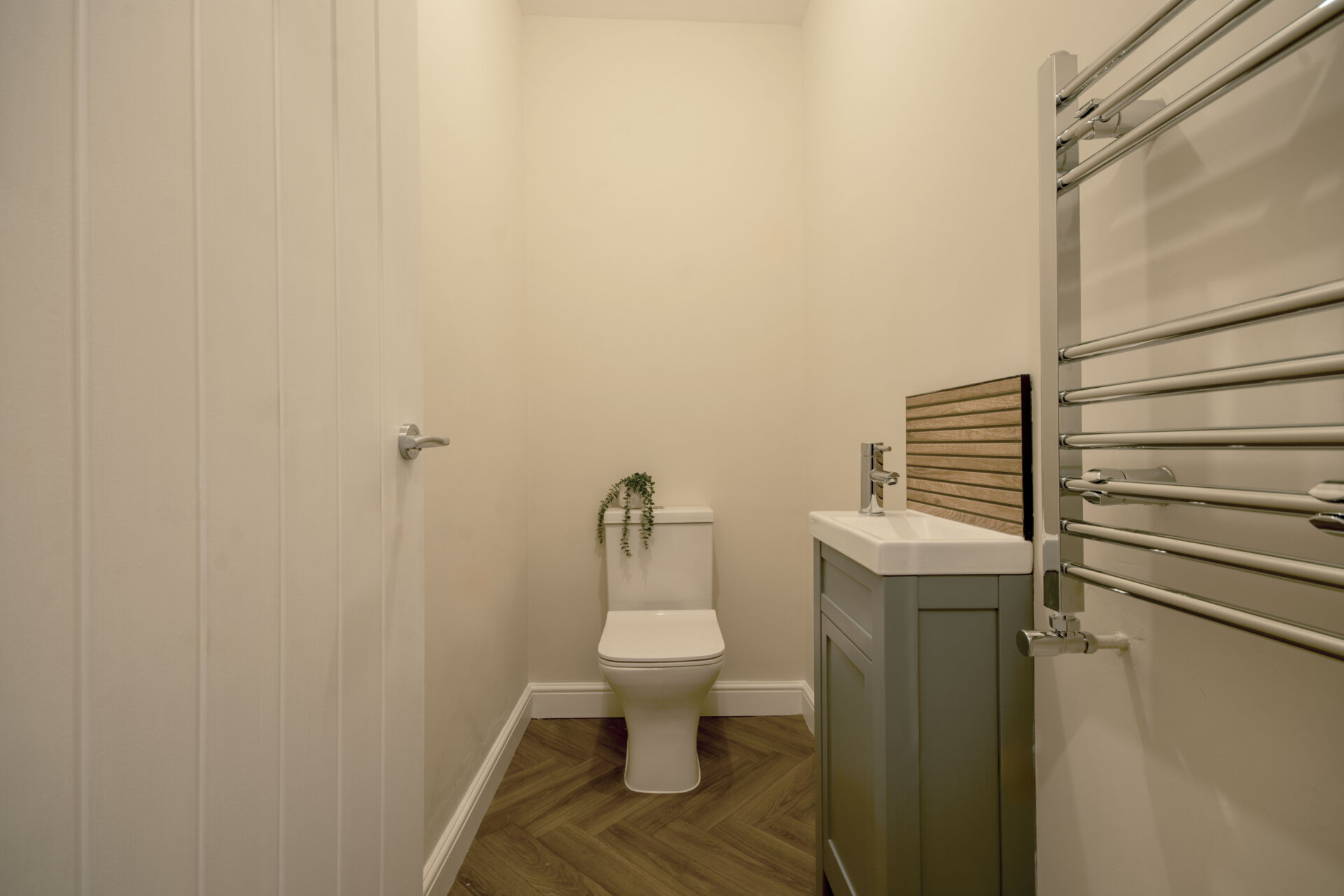 A new refitted WC and wash hand basin, wood effect flooring and ladder style radiator.