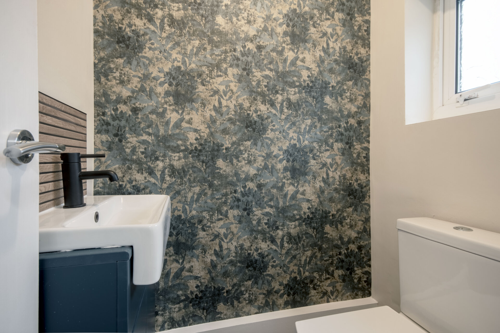 New refitted shower room. Double walk in shower units with waterfall shower and mixer tiled splashbacks backs, vanity unit with inset wash hand basin and low flush WC, ladder style radiator, opaque double glazed window to rear.