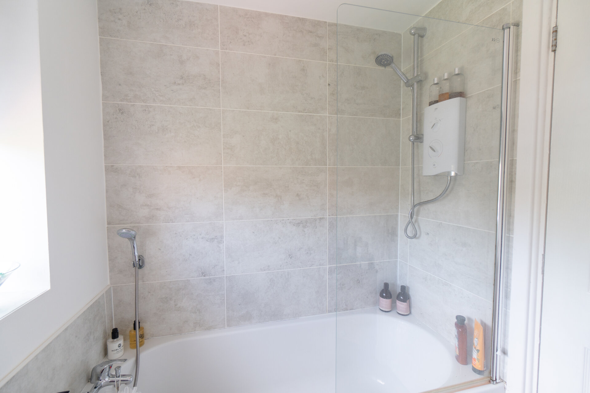 Three piece suite comprising panelled bath with electric shower over, glass privacy screen, pedestal wash hand basin with tiled splash backs, low flush wc, radiator, opaque double glazed window to the rear elevation.