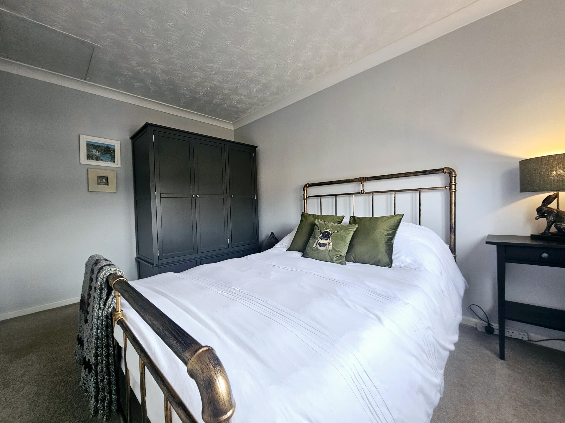 A great size third bedroom with carpet flooring, double glazed window to the front, good size storage cupboard/ wardrobe over the stairs, and radiator.
