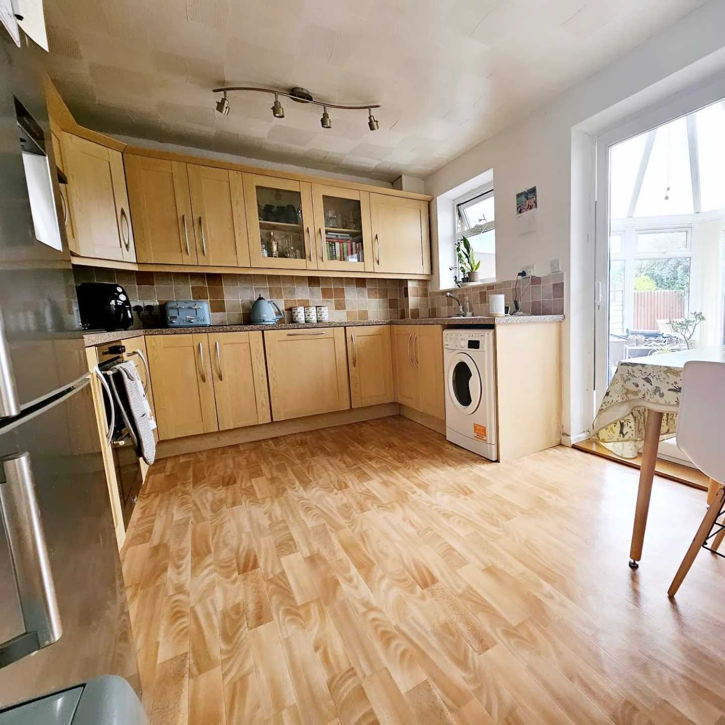 A fantastic open plan kitchen diner with a range of wall and base units, square top work surfaces, one and a half bowl sink and drainer with mixer tap over, tiled splash backs, double glazed window to the rear, electric oven and gas hobs with extractor hood over, integrated dish washer, space for washing machine and fridge freezer, area for dining, radiator and double glazed sliding patio doors to the rear.