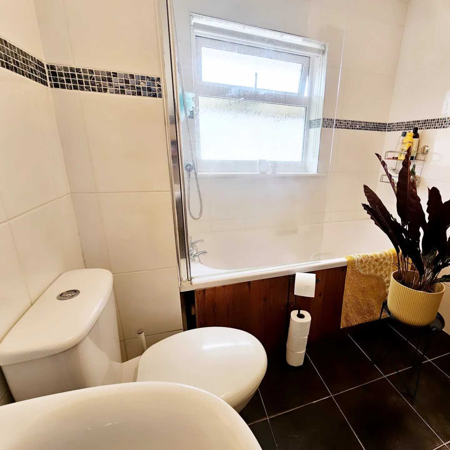 A three piece bathroom suite comprising panelled bath with shower over, pedestal wash hand basin, low flush w.c, cupboard housing the combination boiler, tiled flooring and double glazed window to the rear elevation