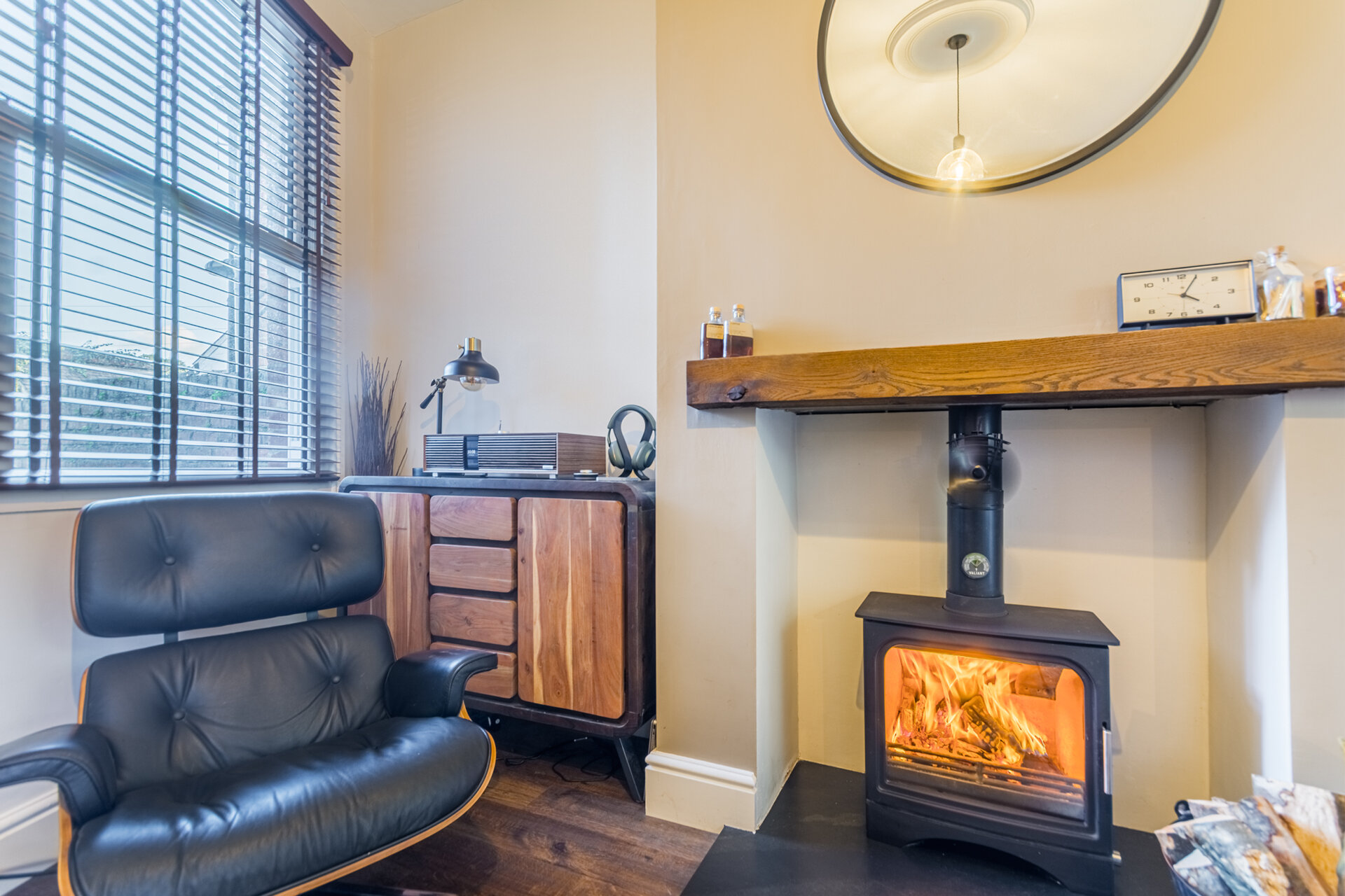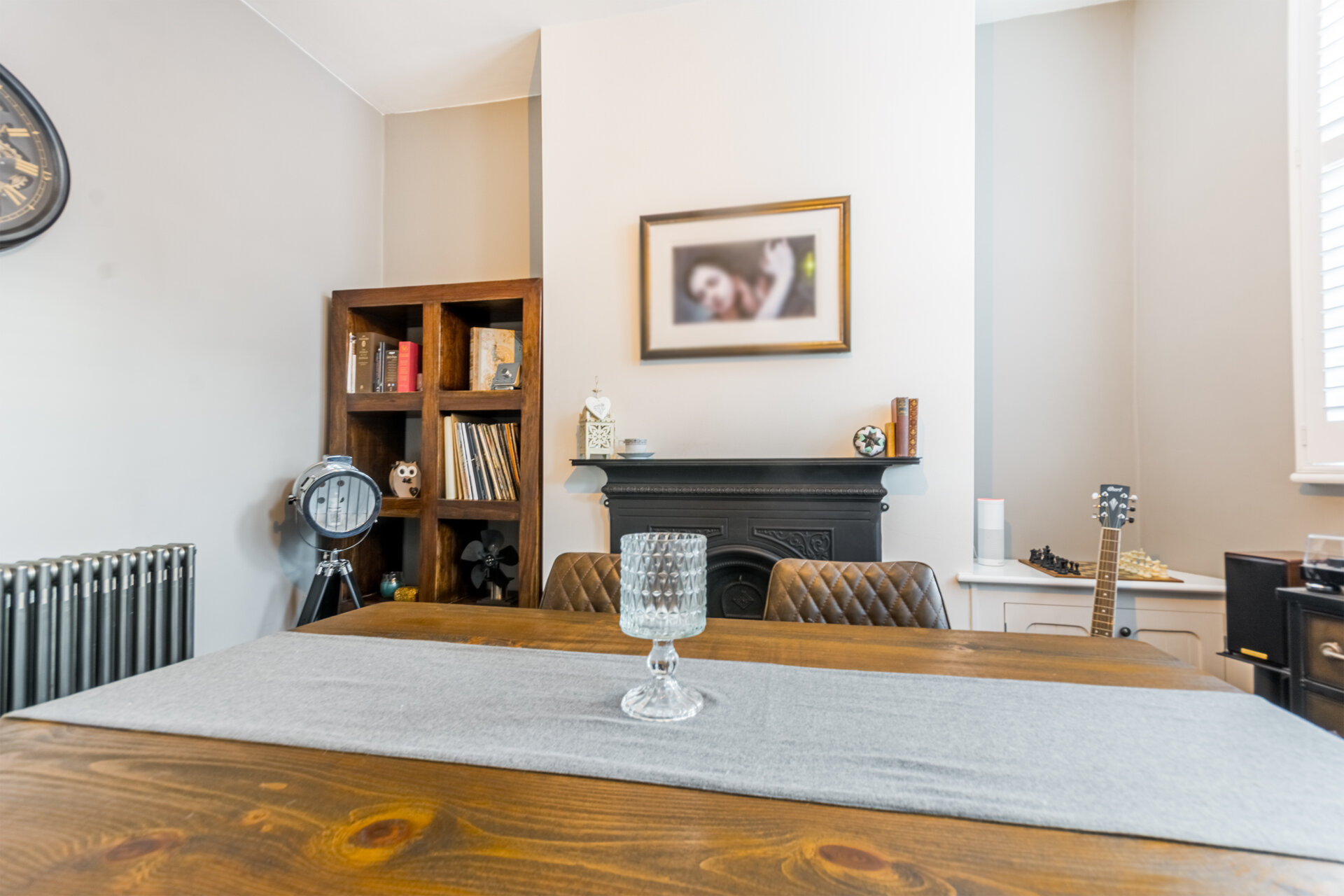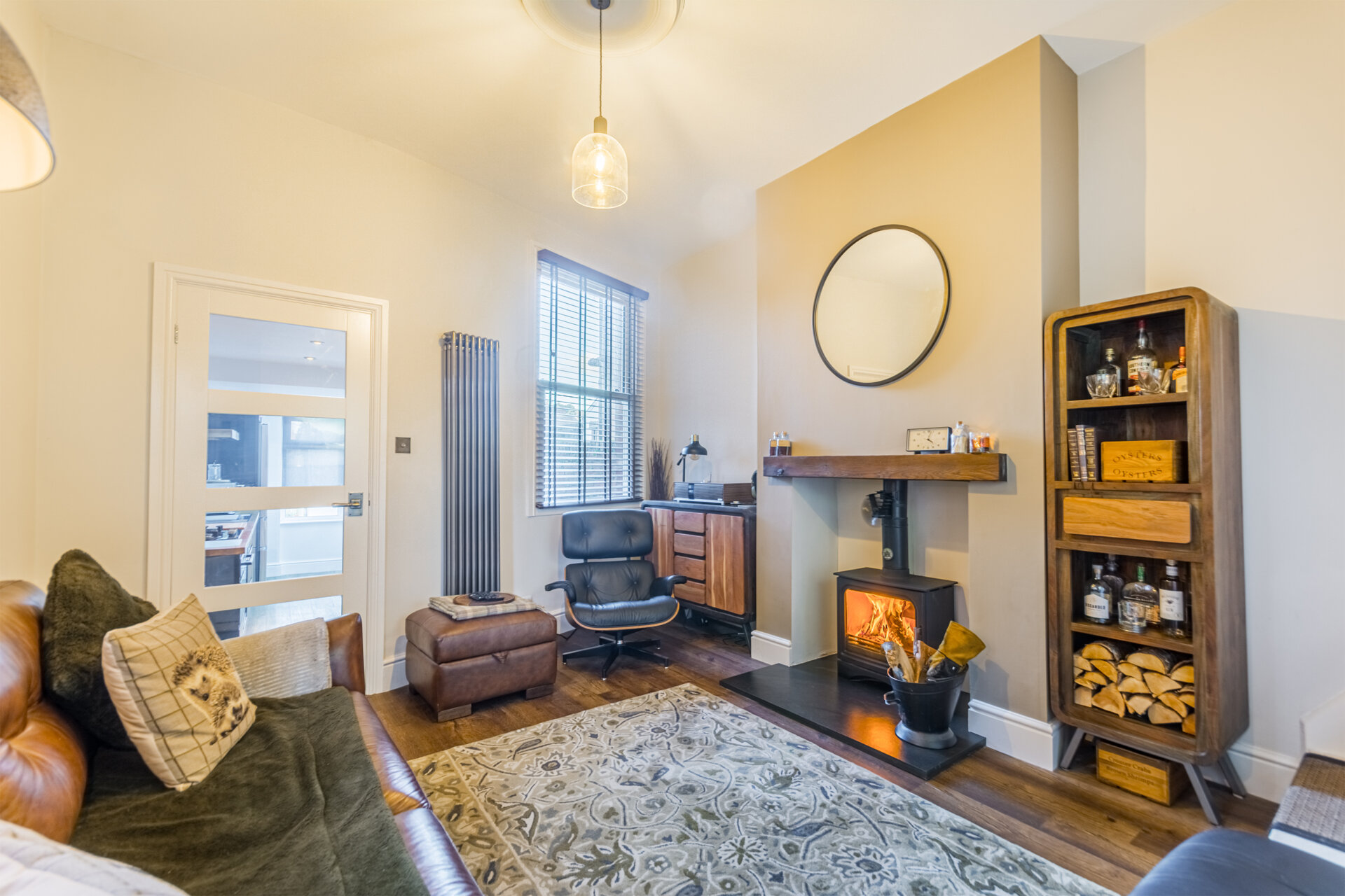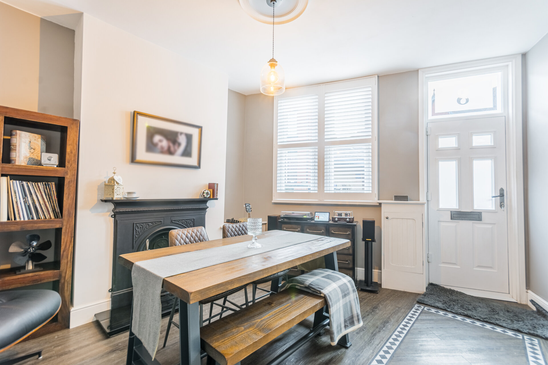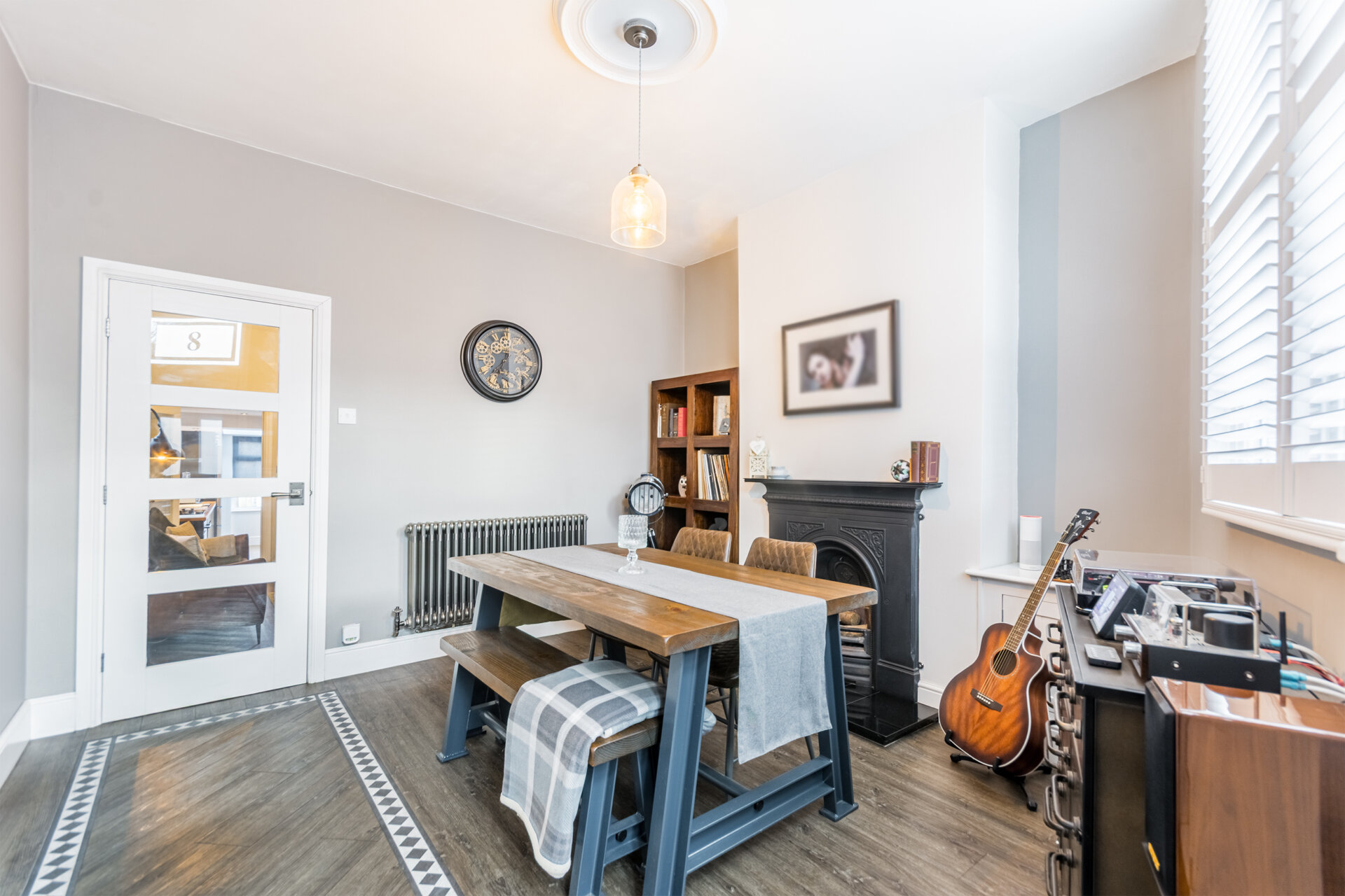 Currently used as a dining room this traditional home has been brilliantly designed with updated original features, with double glazed composite door to enter, Amtico wood flooring, double glazed sash window to the front elevation, fitted shutters, chimney breast with cast iron feature fire with recess alcove either side, cupboard housing the meters, column radiator and high ceiling.