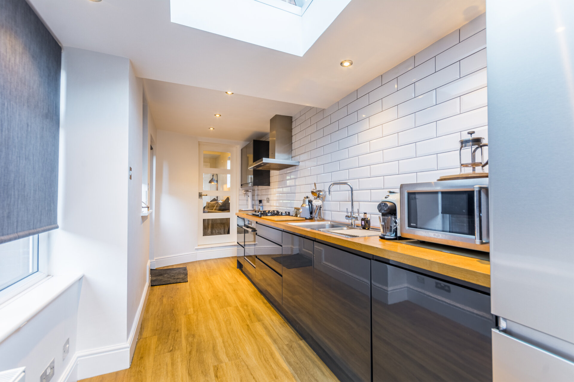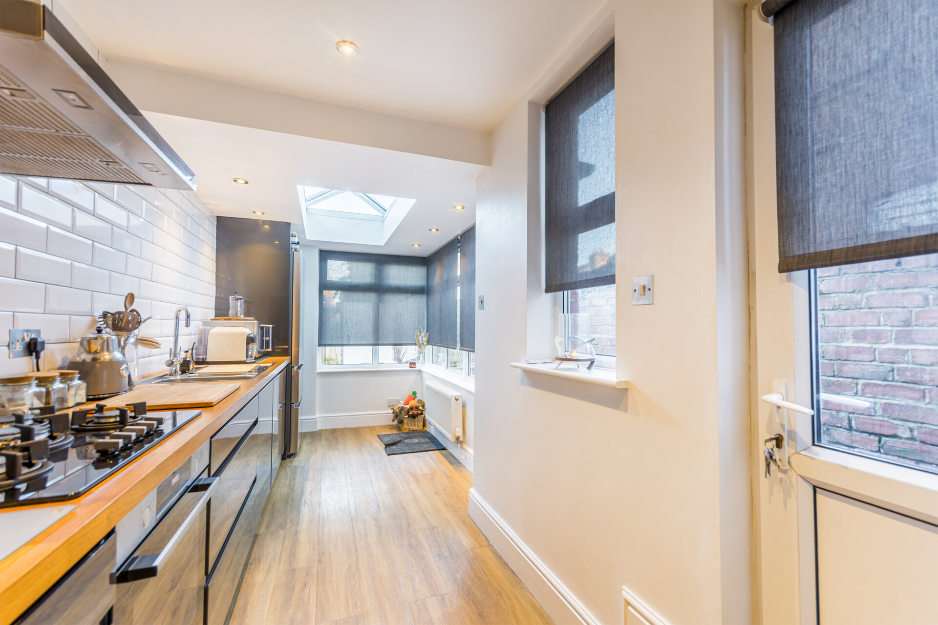 A superb refitted kitchen with a range of wall and base units, with square top oak surfaces tiled splash backs, sink and drainer with boiler tap ( pro boil ) , inset rangemaster five ring burner hobs with extractor hood over, electric oven and grill, integrated washing machine and dryer, 'American' fridge freezer with pantry cupboards surrounding, extended kitchen with lantern and double glazed windows to the right and rear elevation with electric blinds and double glazed door to the right elevation.