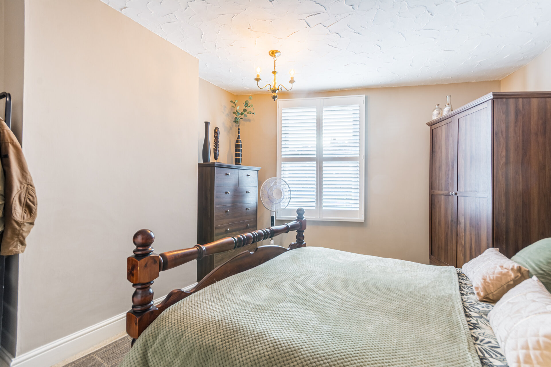 A great size double bedroom with double glazed sash window to the front elevation, fitted shutters, chimney breast with recess alcove to either side, radiator and carpet flooring.