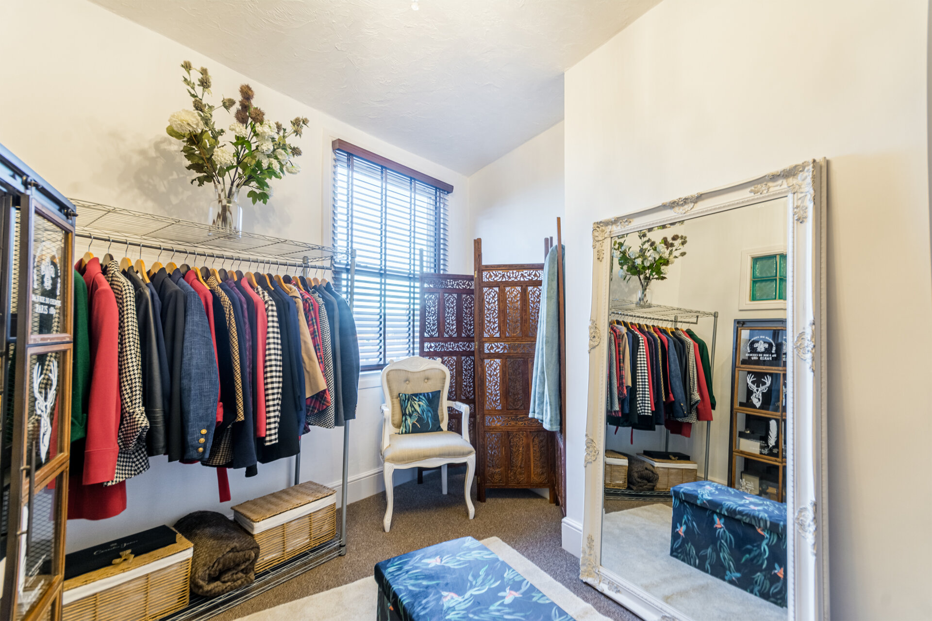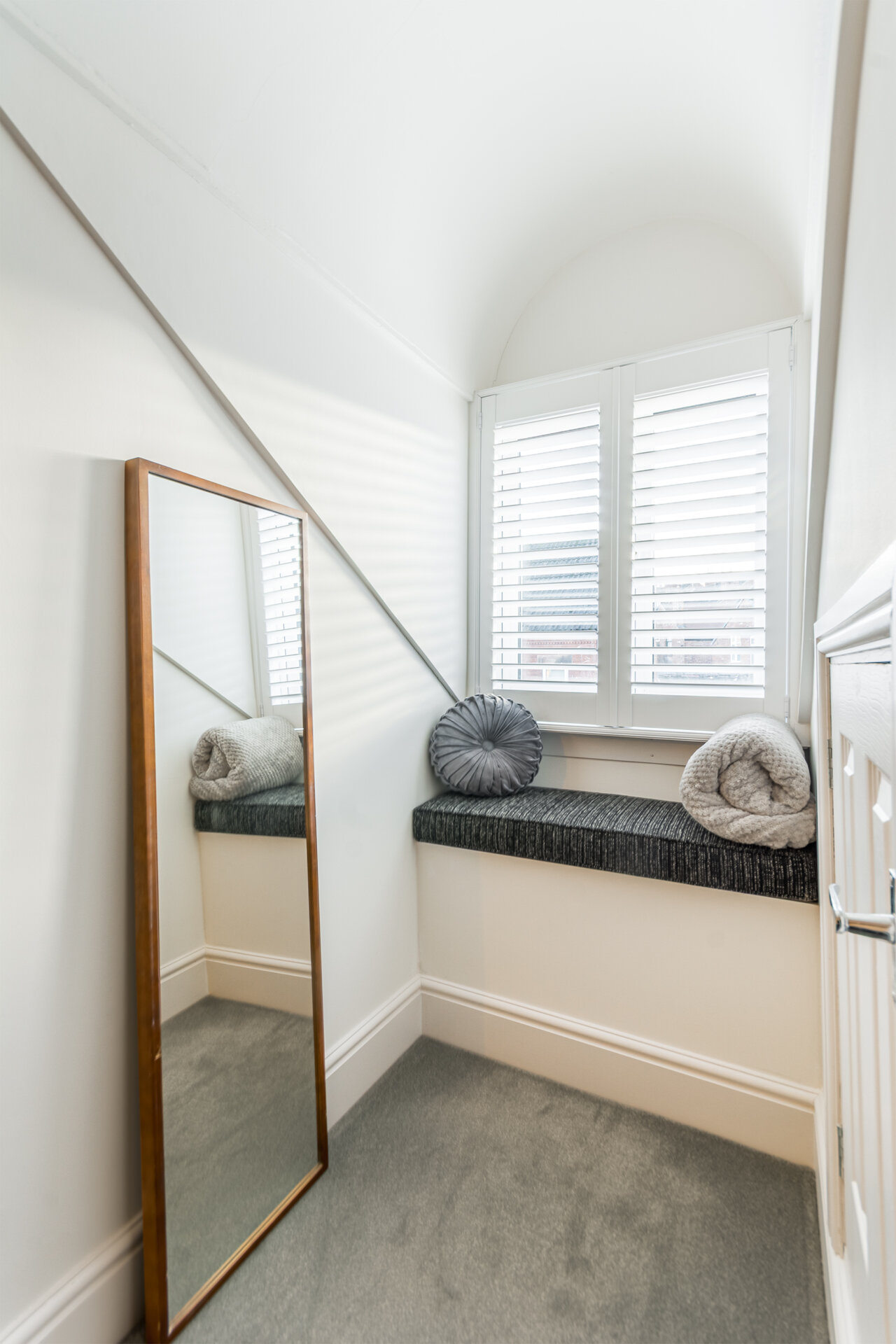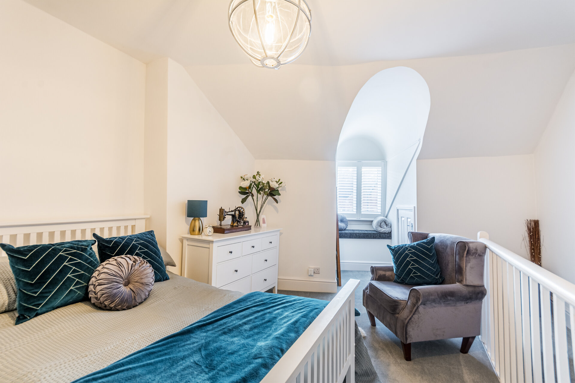 Staircase leading to the second floor with balustrade , a beautiful double bedroom with double glazed window to the front elevation, window seat, carpet flooring, storage to the eaves, larger cupboard to eaves to the rear housing the combi boiler and plenty of room for storage.