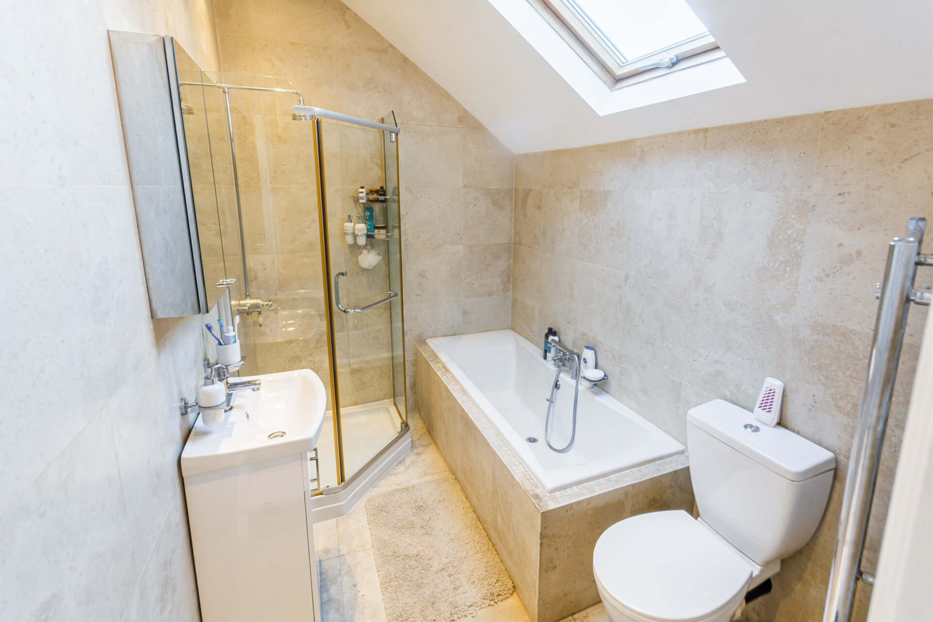 A refitted white four piece bathroom suite comprising a corner shower with waterfall shower and mixer, tiled splash backs, tiled panelled bath with taps and mixer shower over, wc, vanity unit with inset wash hand basin, vaulted ceiling with 'Velux' window and ladder style radiator.