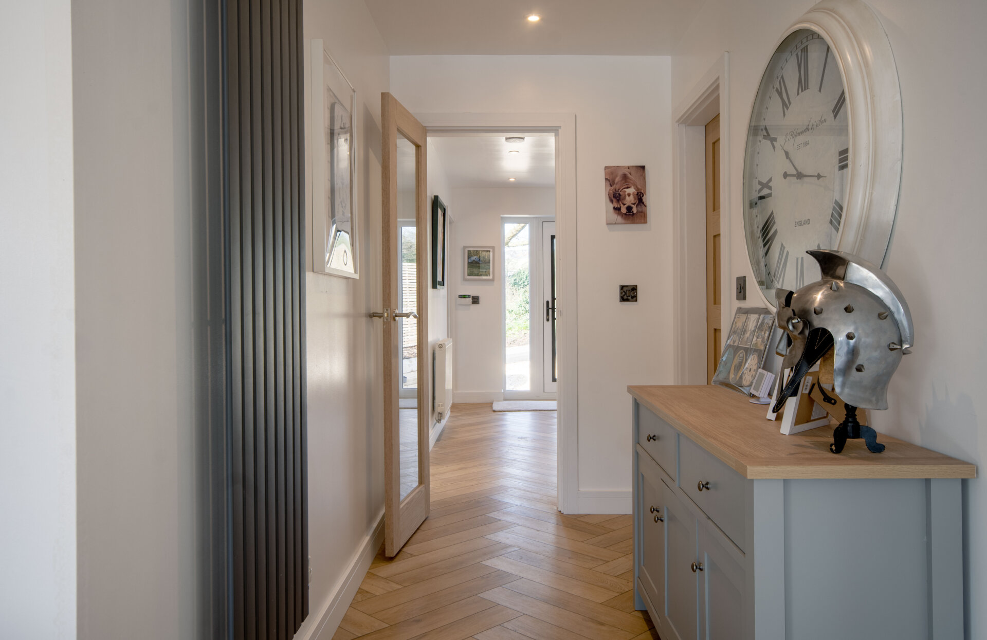 Step into this spacious hallway with karndean flooring, stunning wrap around staircase with oak balustrade and glass inserts, wine rack. double glazed window to the left elevation, radiator and doors to reception rooms.