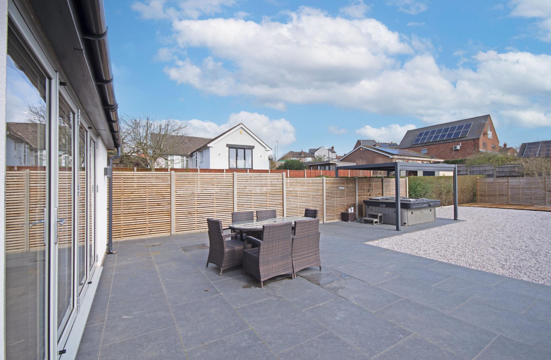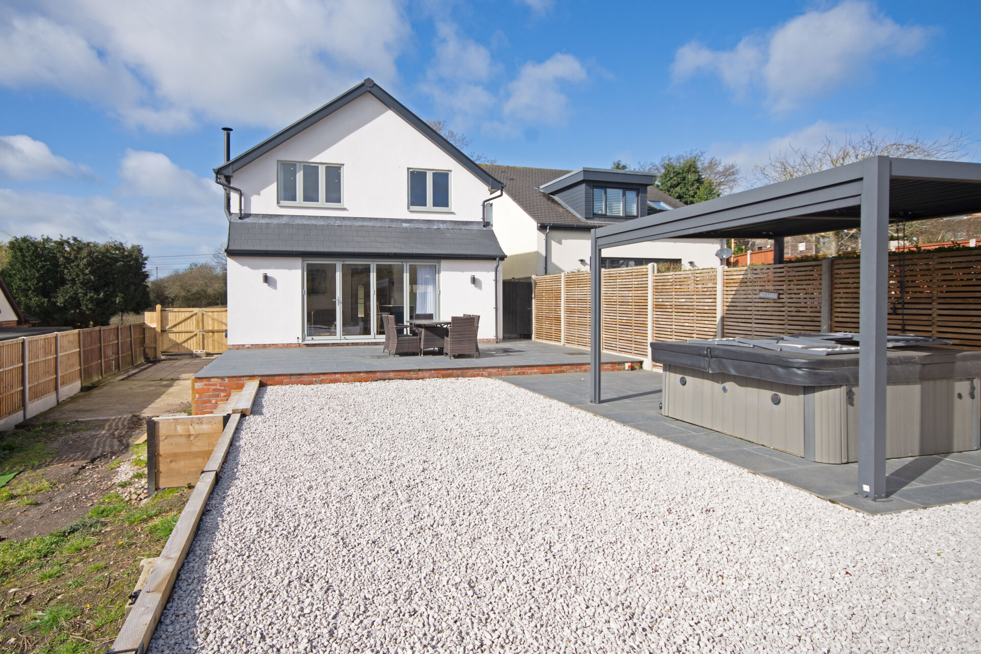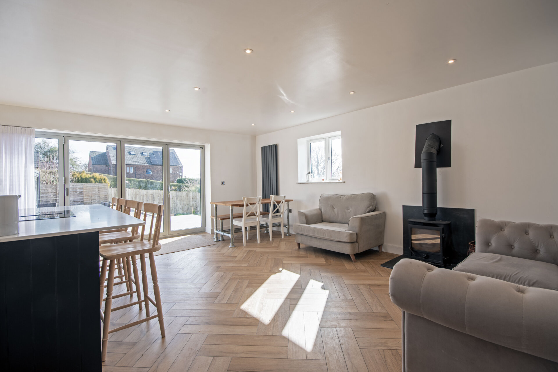 The space flows seamlessly into a dedicated dining area with double glazed window to the right elevation, complete with a contemporary vertical radiator and double-glazed bi-folding doors opening onto the rear elevation. The lounge area offers a cosy retreat, featuring a log burner and continued Karndean flooring throughout, enhancing both style and continuity.