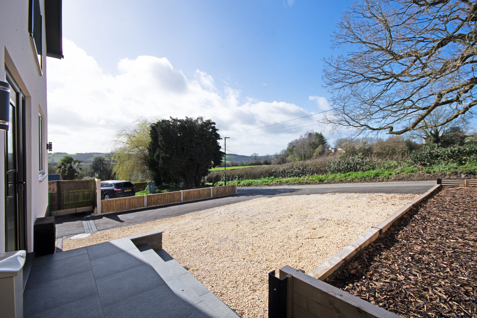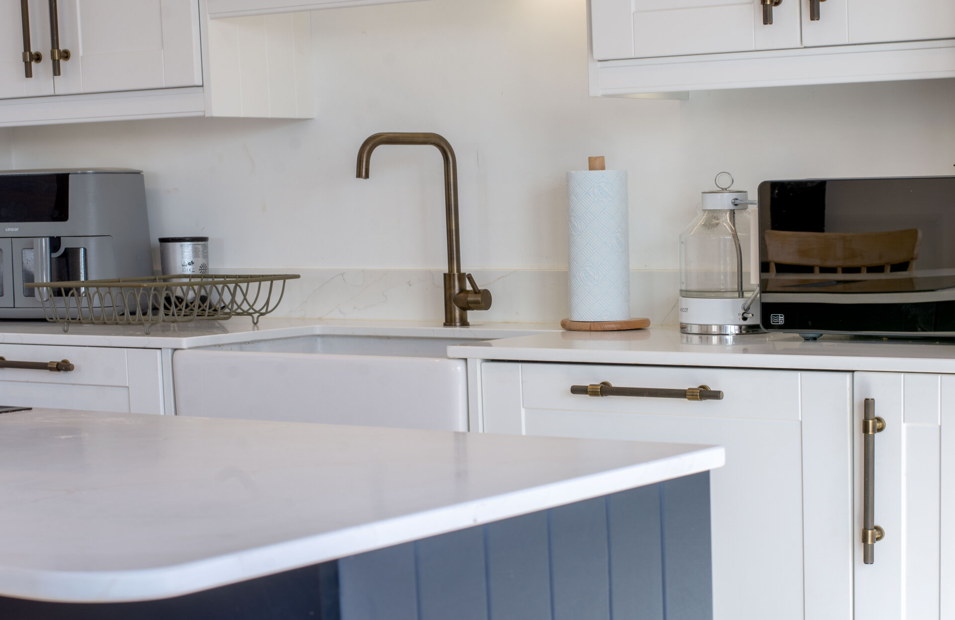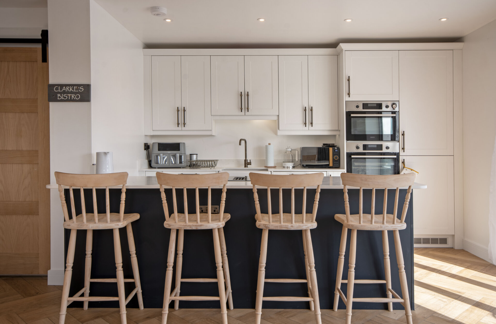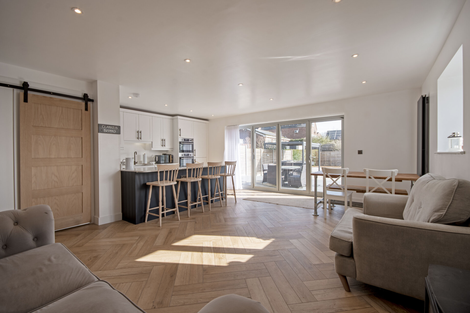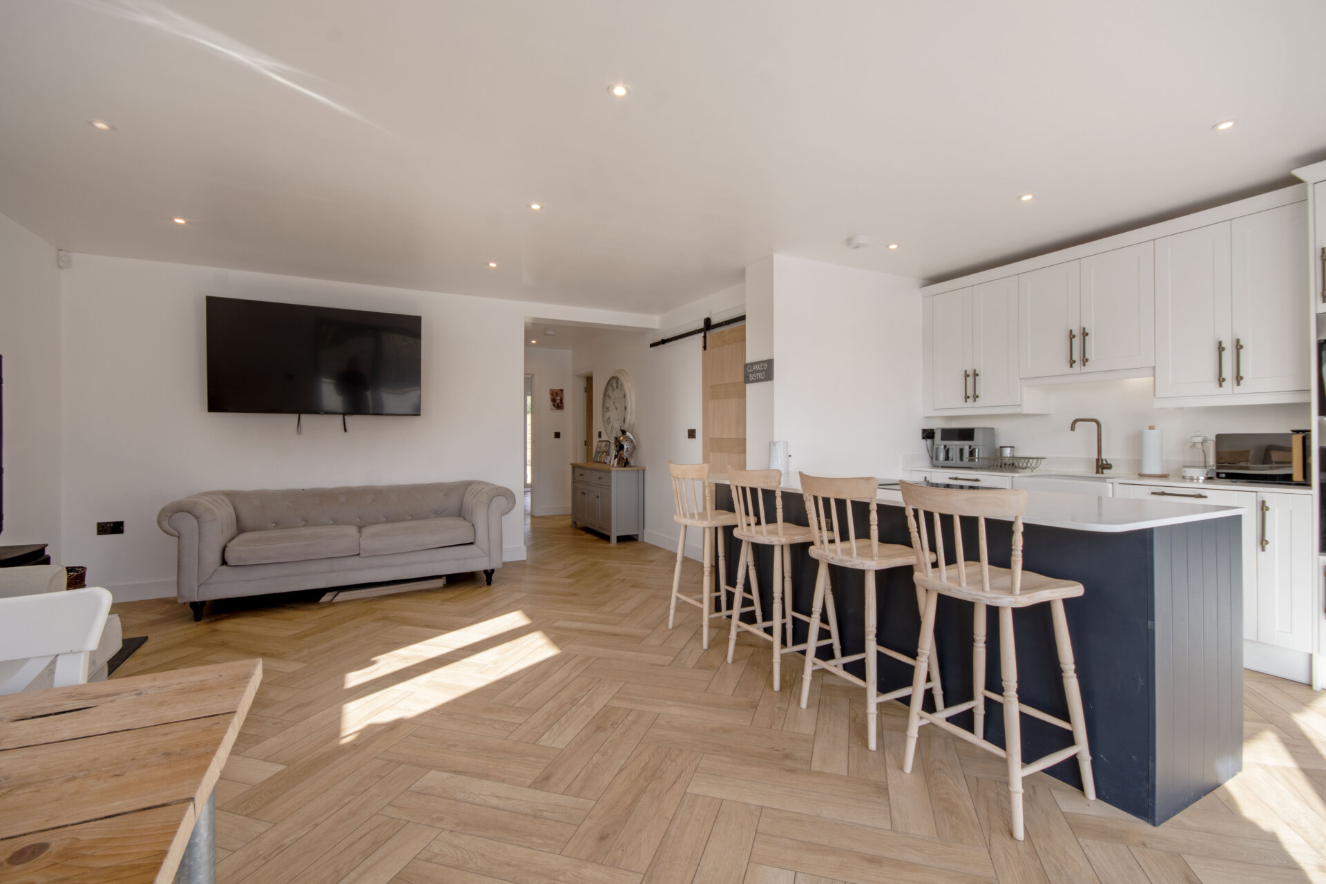 The heart of the home features a beautifully designed open-plan kitchen, dining, and living area. The kitchen is fitted with a range of shaker-style wall and base units complemented by square-edged work surfaces. Integrated appliances include a standing-height oven and grill, microwave oven, fridge freezer, and dishwasher. A Belfast sink with mixer tap sits beneath thoughtfully arranged workspace, alongside Bora induction hobs with a downdraft extractor. A breakfast bar provides seating for up to four stools.