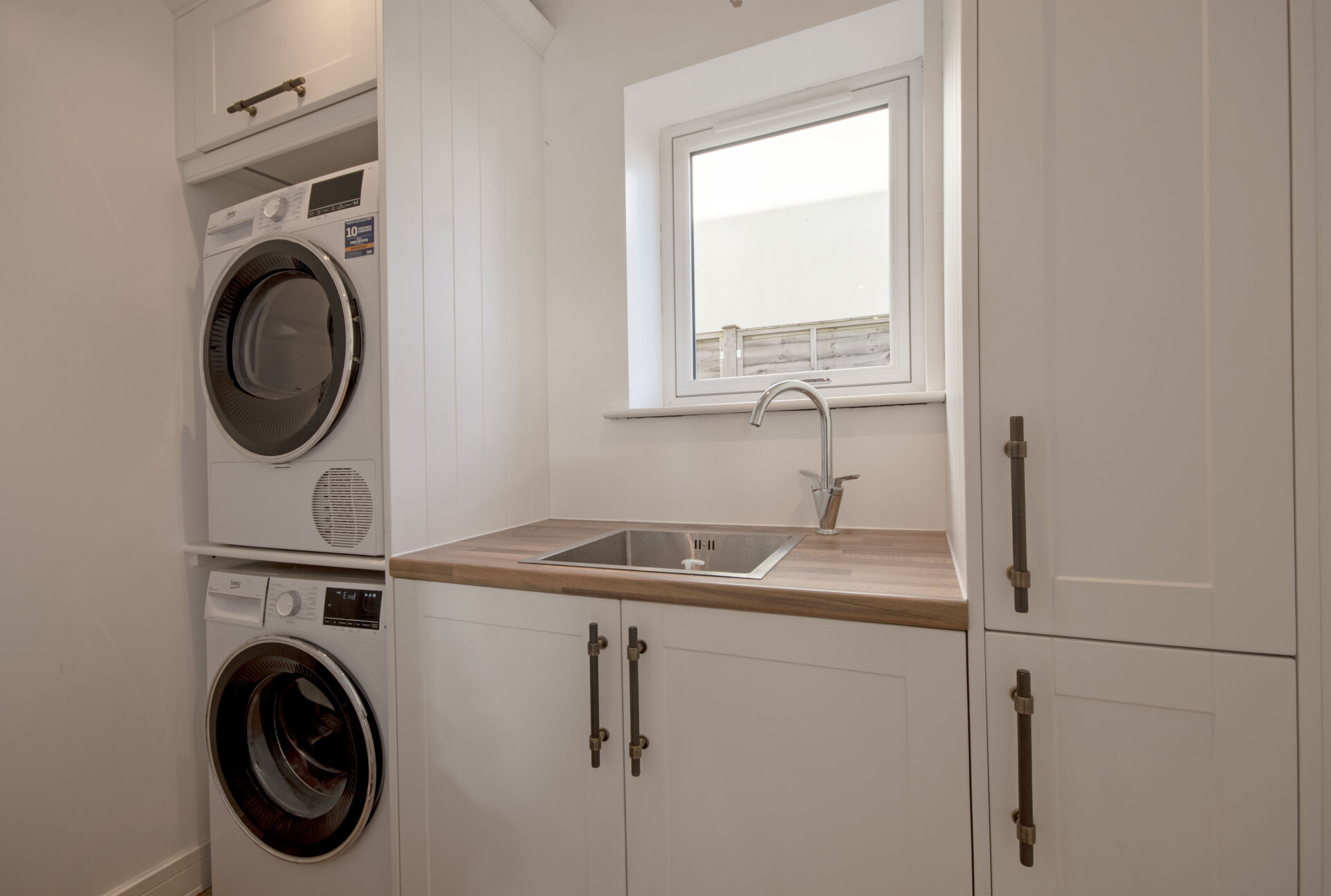 Sliding barn door to enter this convenient utility room with a range of wall and base units with roll top work surfaces, inset sink with mixer tap. space for washing machine and dryer, double glazed window to the left elevation and radiator.