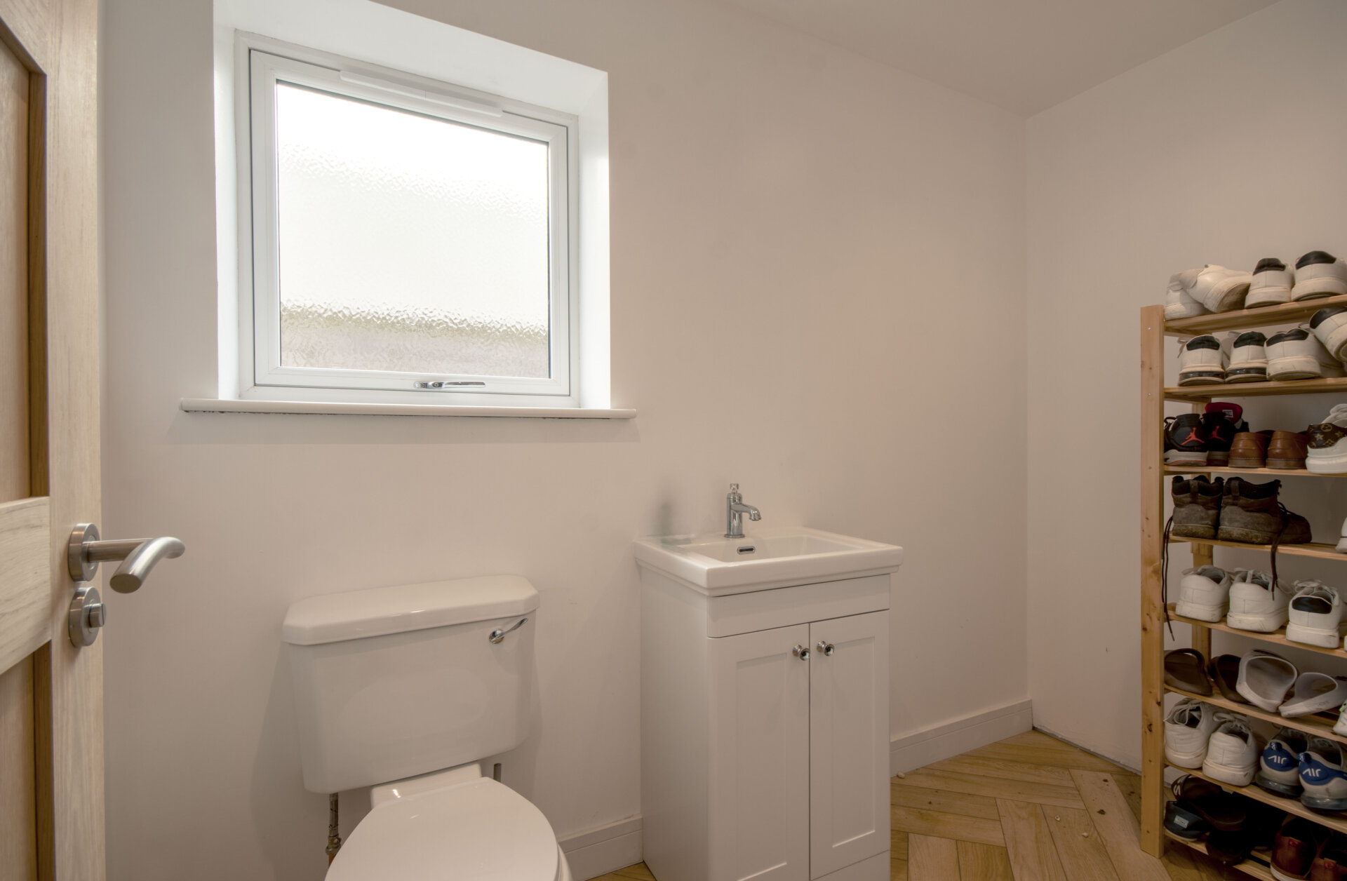 Area for cloaks and shoes, vanity unit with inset wash hand basin, low flush wc, radiator and opaque double glazed window to the left elevation.