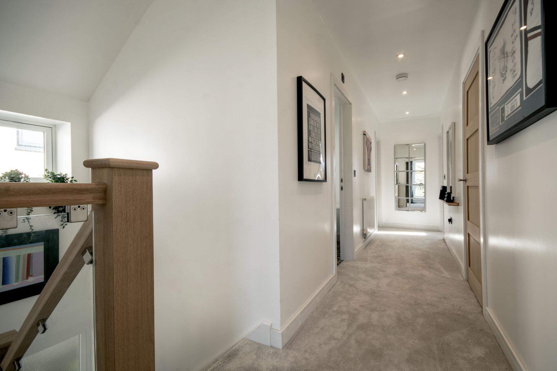 A stunning wrap around staircase with oak balustrade and glass inserts, carpet flooring, vaulted ceiling with double glazed window to the left elevation, on the landing a great size airing cupboard and boiler room.