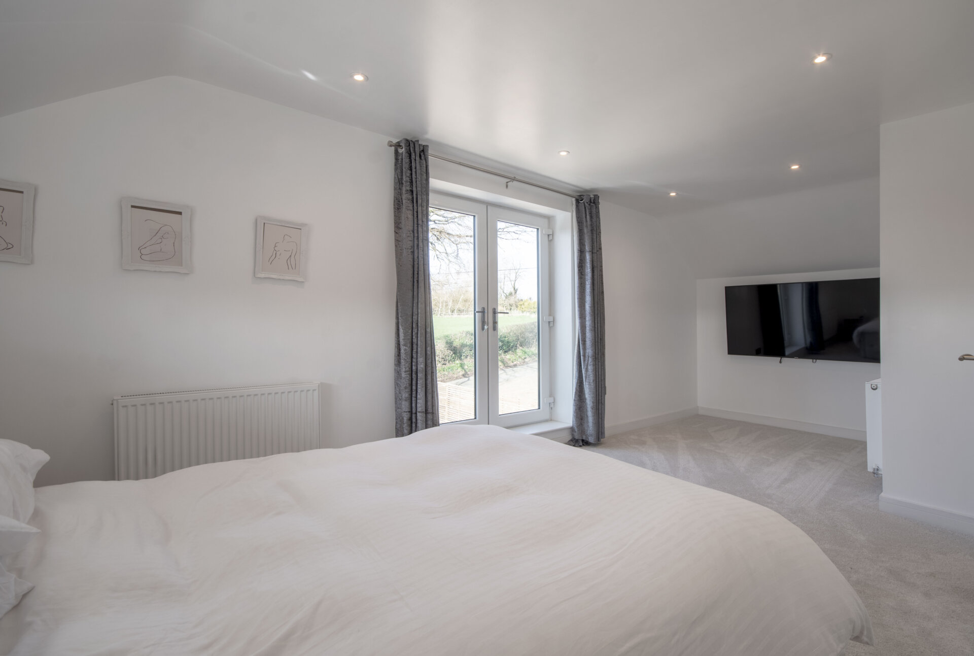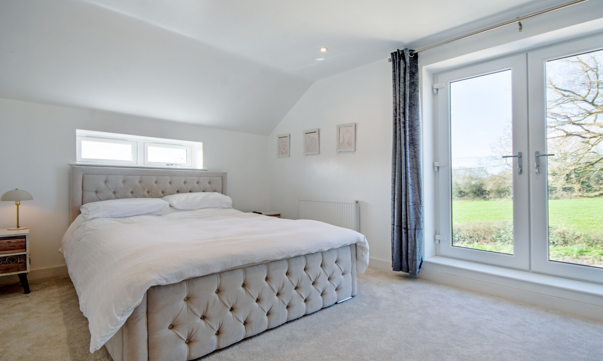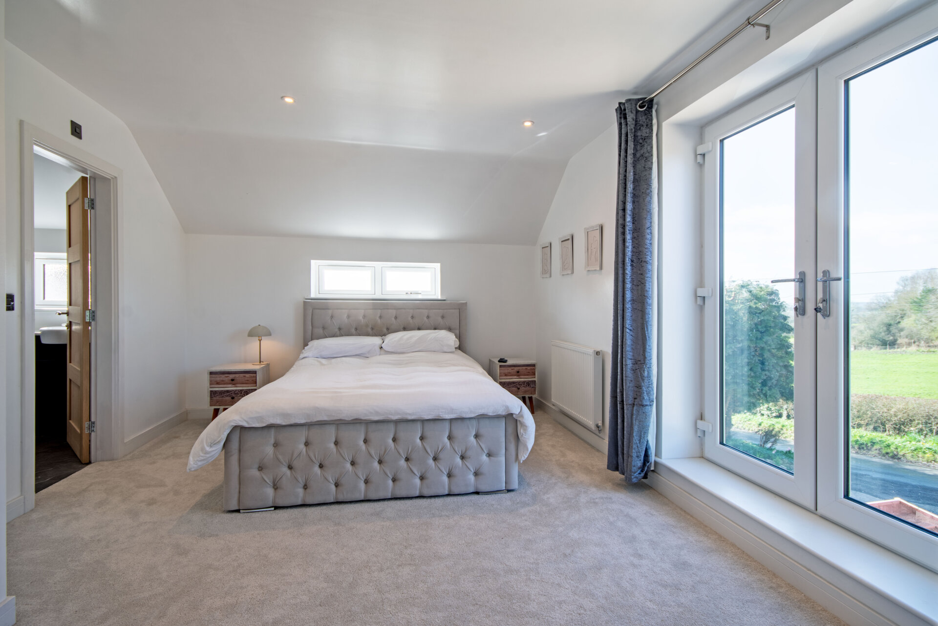 A superb main bedroom with a double glazed French doors with Juliet balcony to the front elevation over looking the incredible open countryside views, carpet flooring, vertical double glazed window to the right elevation, two radiators and door to en-suite.