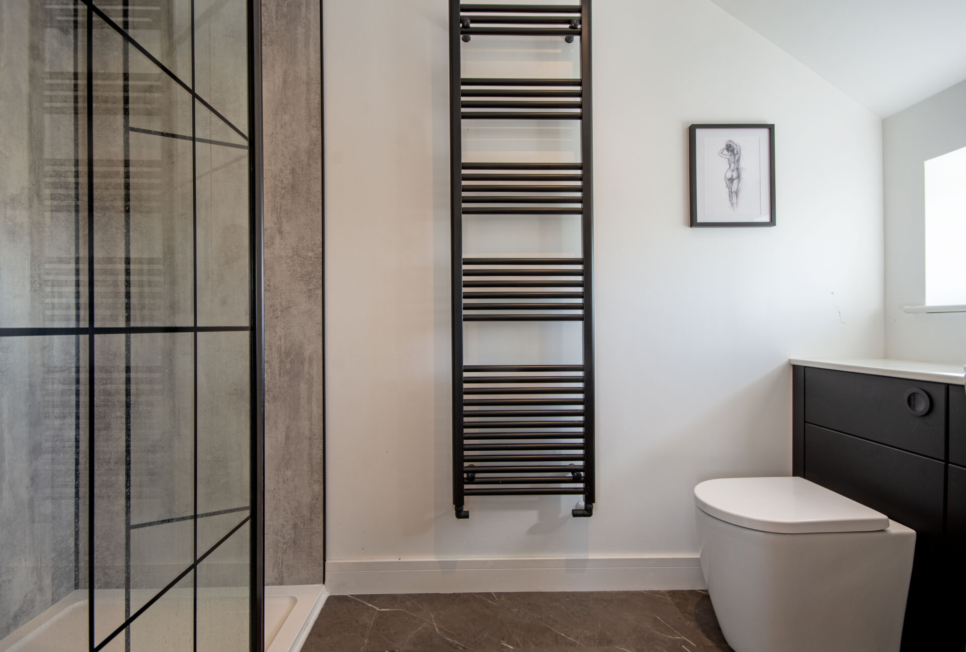 A stunning three piece ensuite shower room comprising of a walk in double shower with shower over and mixer, panelled splash backs, vanity unit with inset wash hand basin and low flush wc, ladder style radiator and an opaque double glazed window to the right elevation.