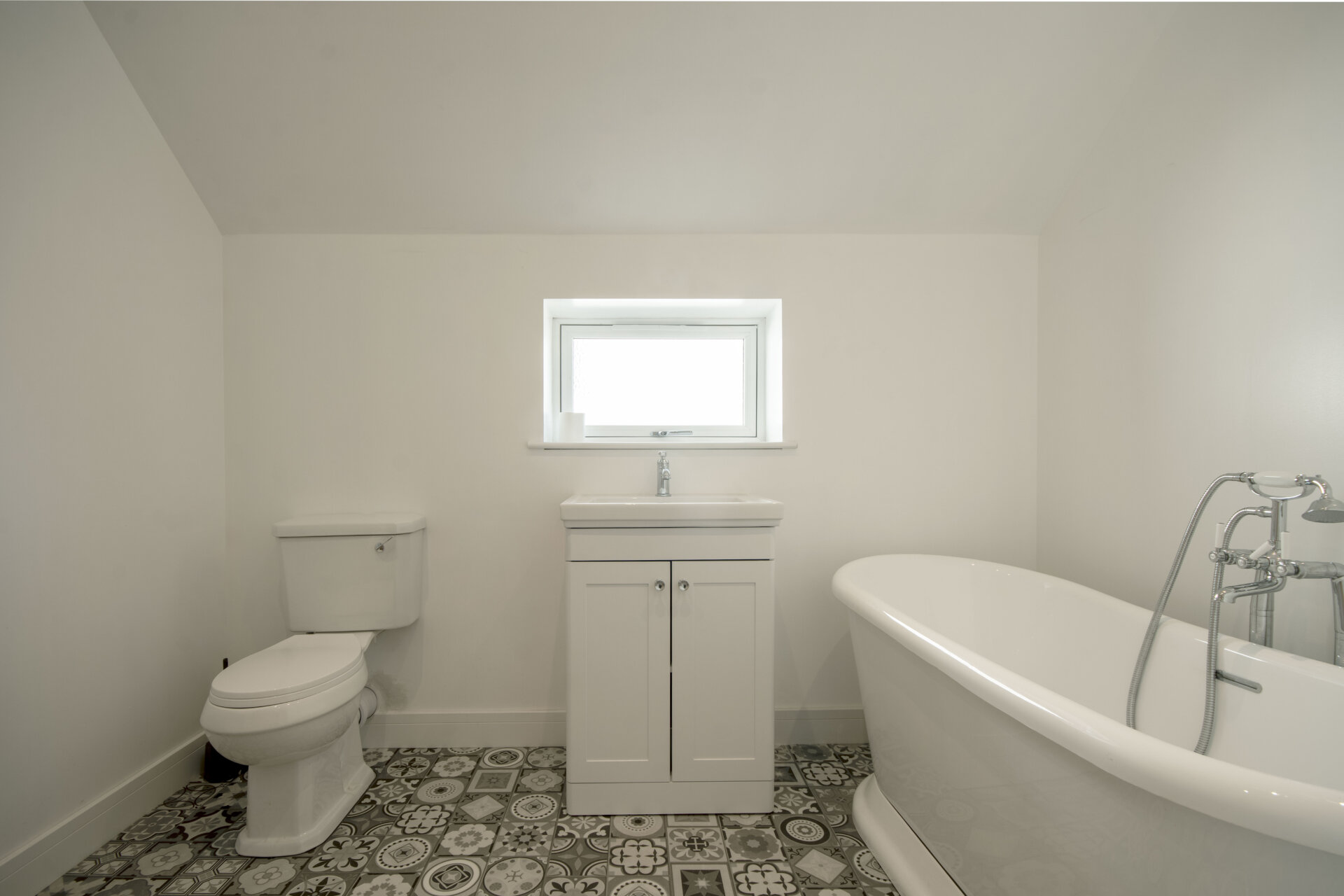 A beautiful three piece family bathroom comprising of a freestanding double ended bath with taps and mixer shower, vanity unit with inset wash hand basin, low flush wc, opaque double glazed window to the left elevation, mosaic flooring and ladder style radiator.
