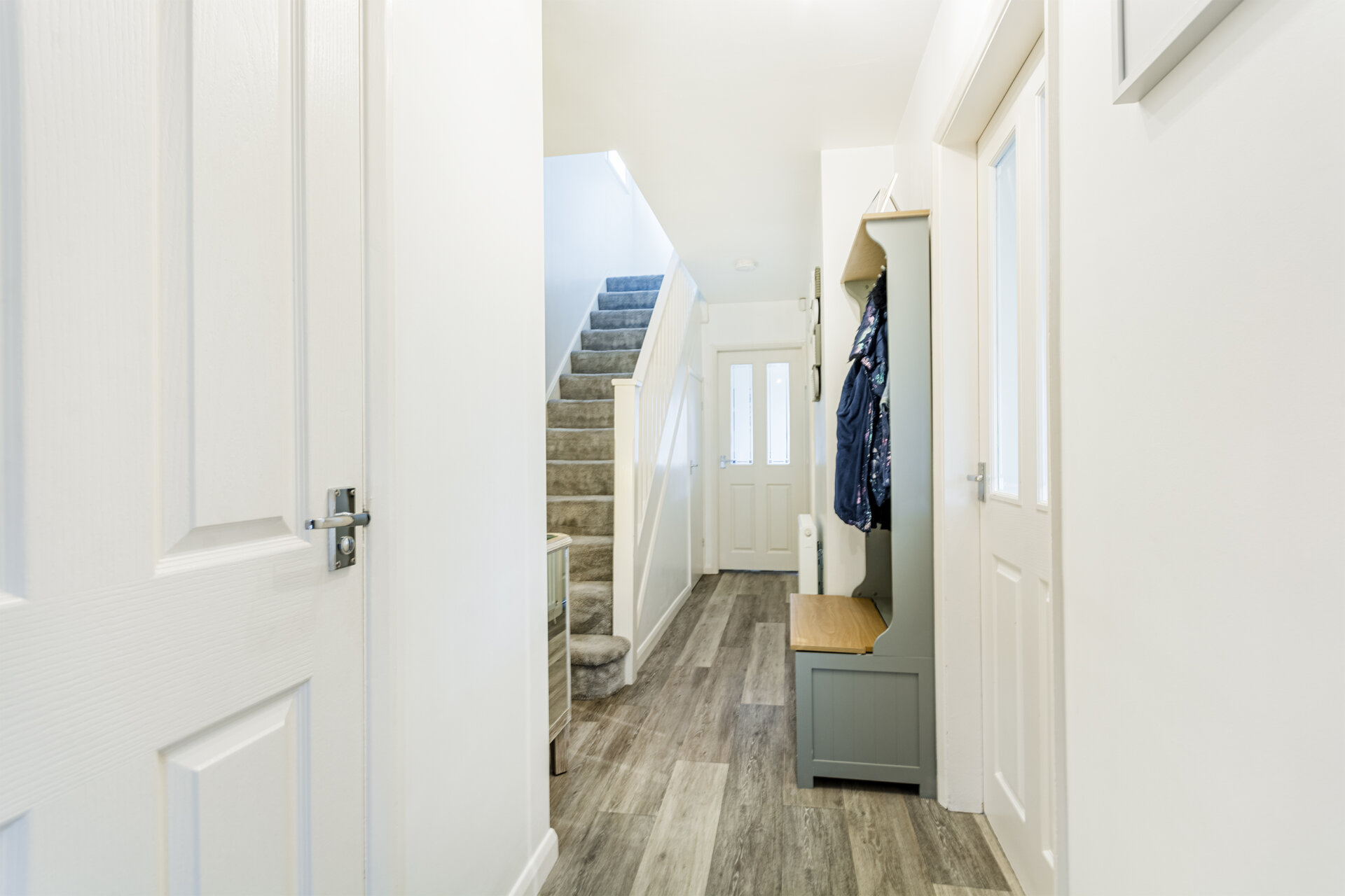 Composite entrance door to the front elevation, radiator, under stairs storage cupboard, laminate flooring, stairs leading to the first floor landing.