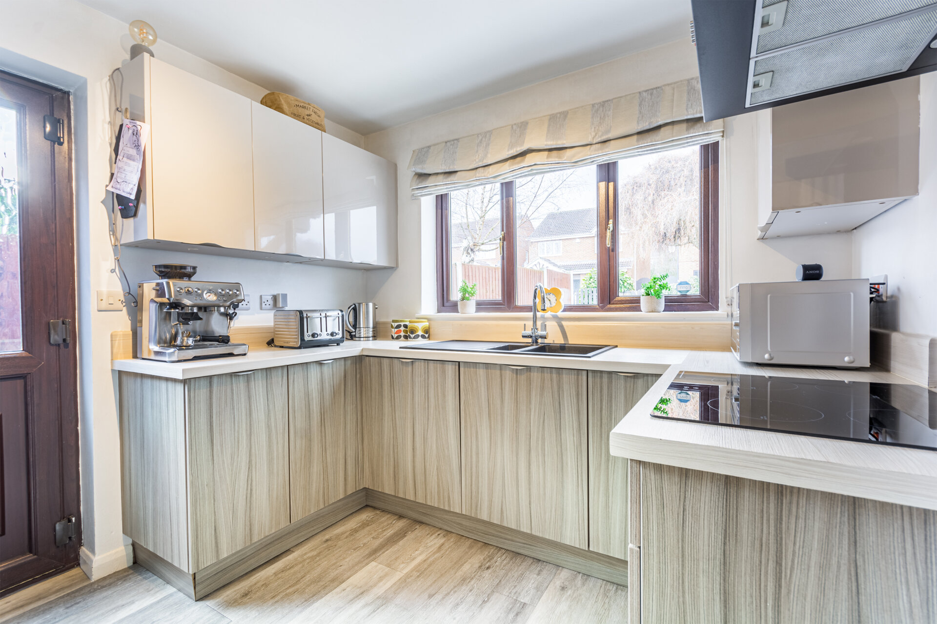 Comprising a range of wall, base and drawer units incorporating roll top work surfaces, one and a half bowl sink unit with mixer tap over, fitted appliances to include: Oven, hob and extractor fan, fridge-freezer and dishwasher, laminate flooring, double glazed window to the front elevation, double glazed side entrance door to the right elevation.