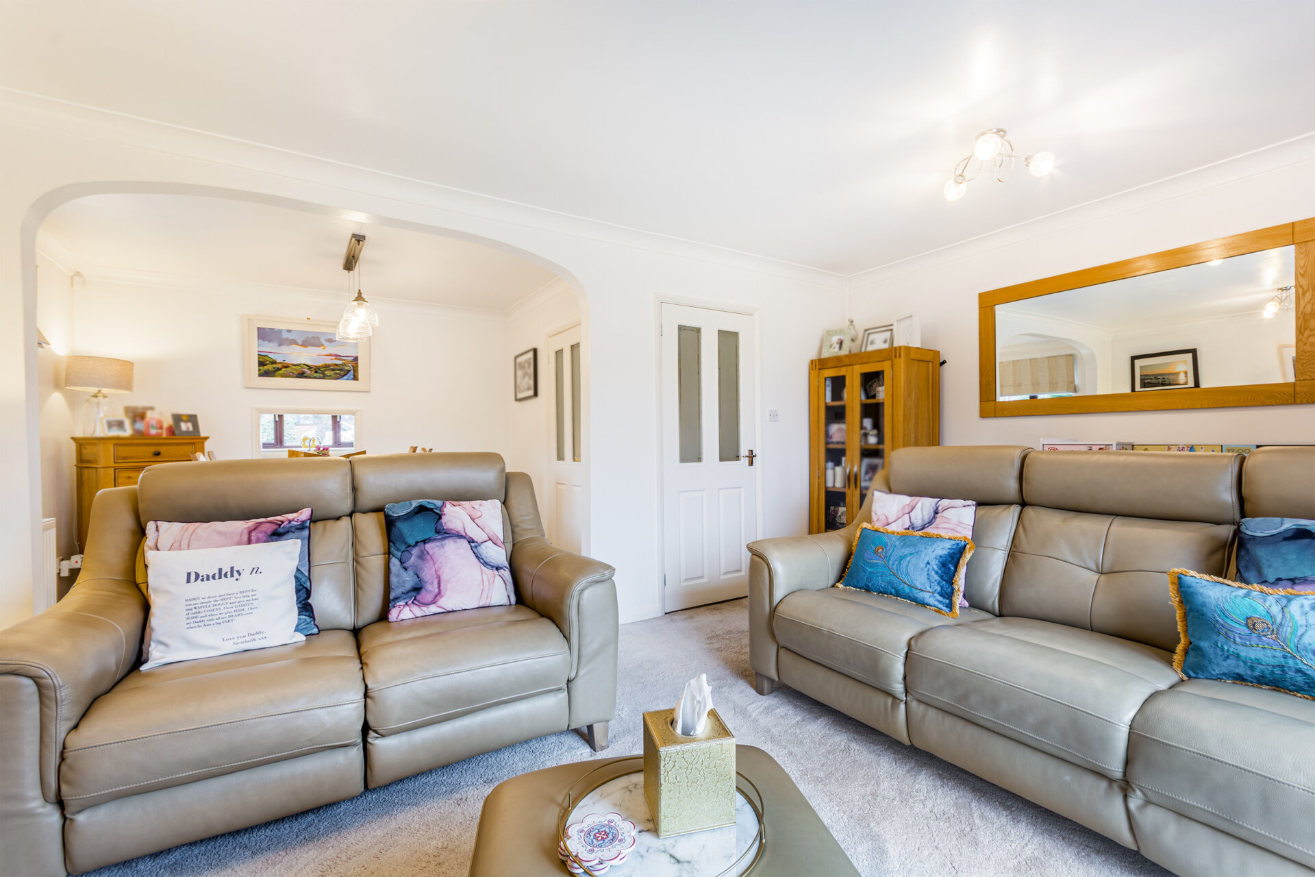 Spacious lounge with feature fire surround, radiator, carpet flooring, double glazed patio door to the rear elevation, archway to the dining area.