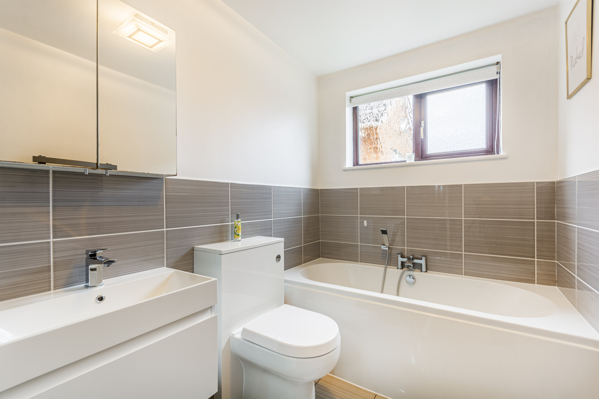Comprising a two piece suite of low flush w.c, wash hand basin set into vanity unit with cupboard beneath, radiator, double glazed window to the front elevation.